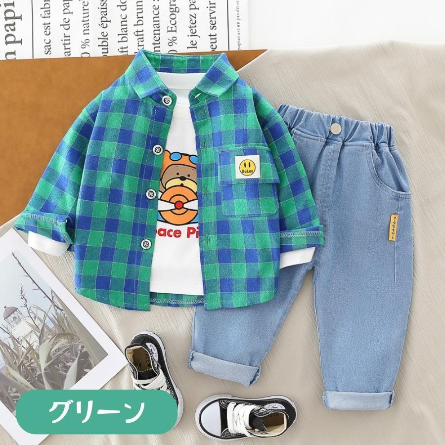 商品名 | グリーン 100cm 3点セット チェック柄 長袖ボタンシャツ デニムパンツ 長袖Tシャツ 上下セット ジーパン セットアップ 韓国子供服 男の子 |