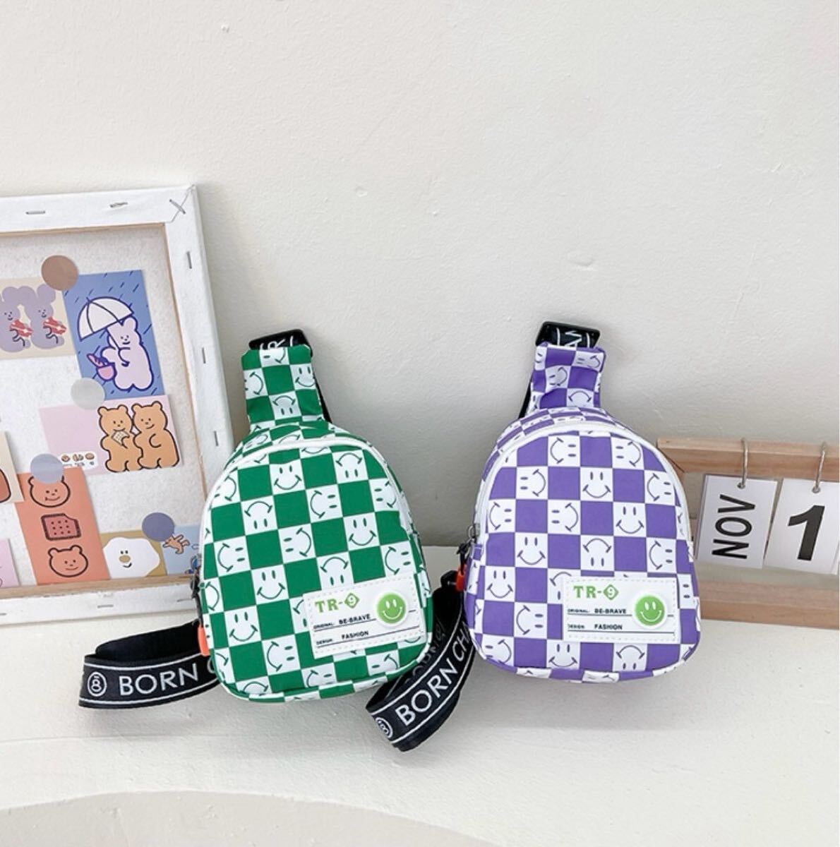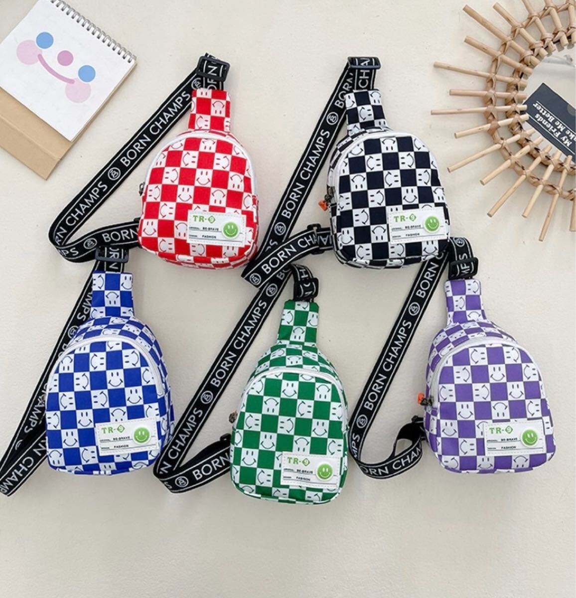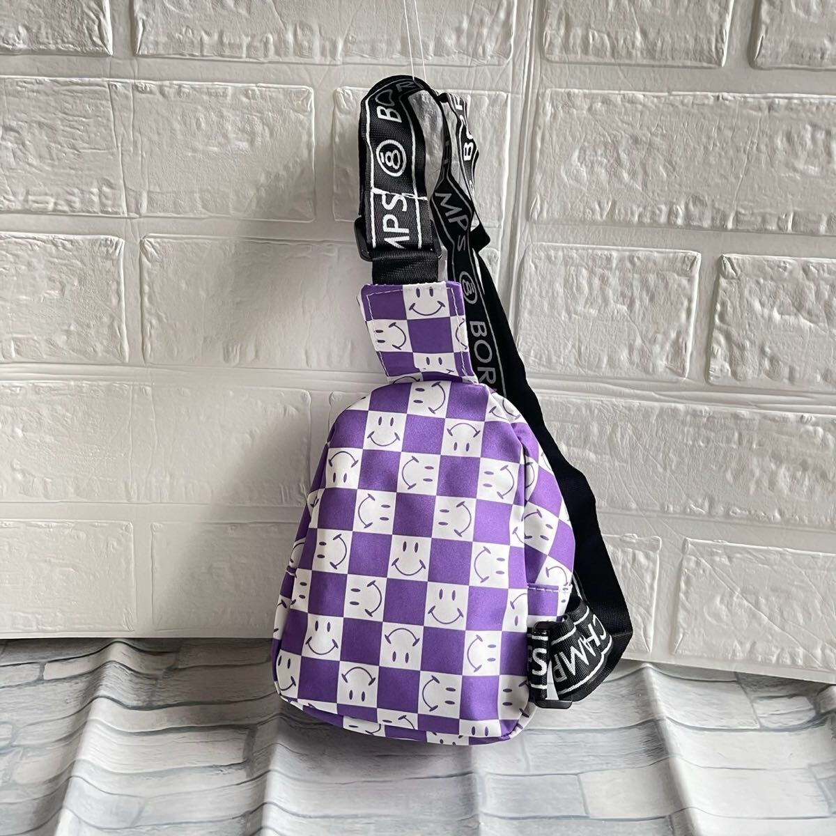 チェック柄にスマイルフェイスがポップで楽しいボディバッグです。軽量で丈夫なナイロン製ですので耐久性があります。