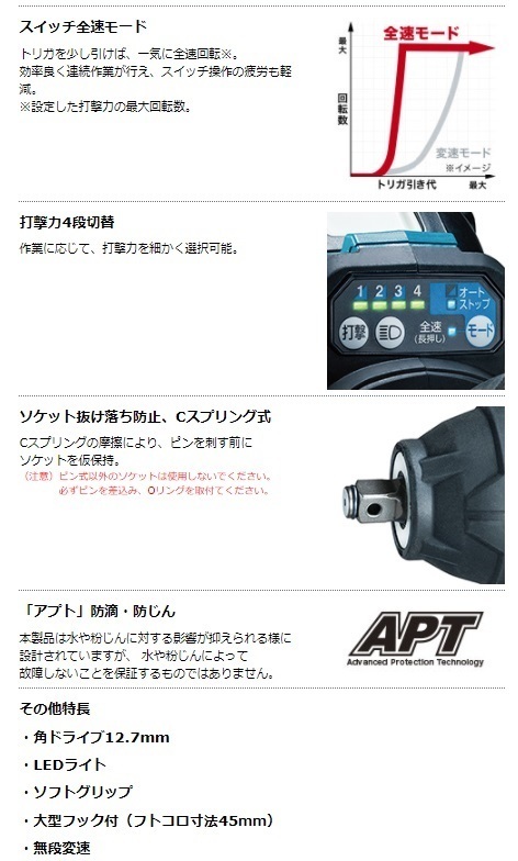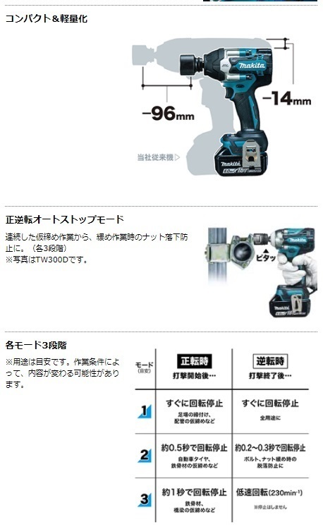 ・正逆転オートストップモード/スイッチ全速モード/打撃力4段切替