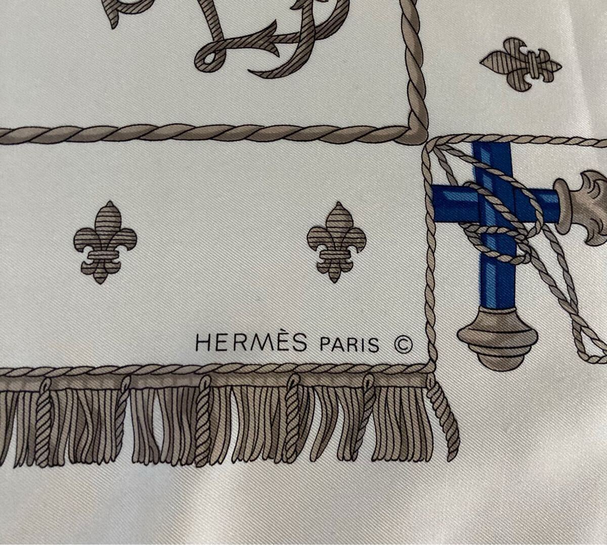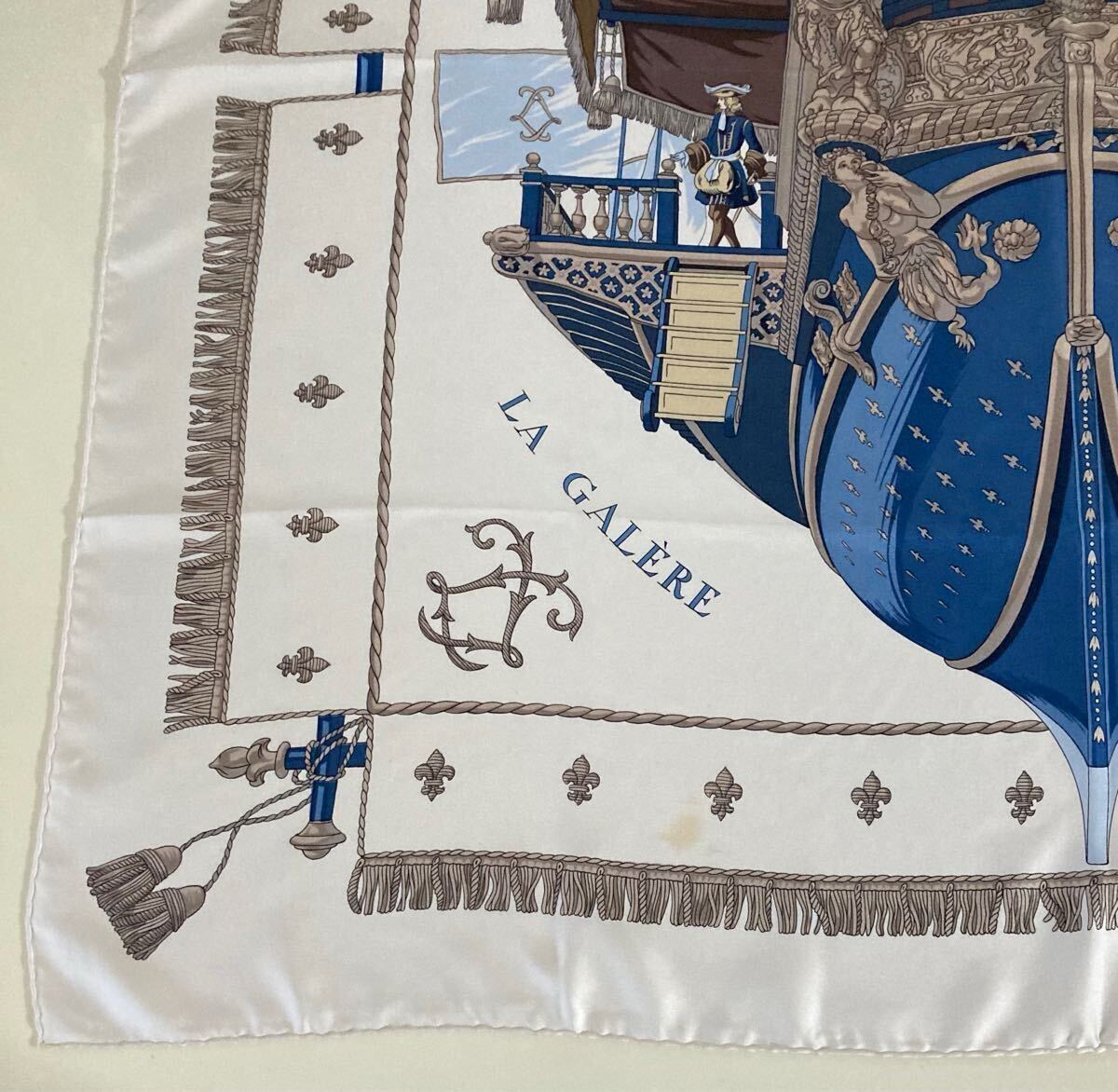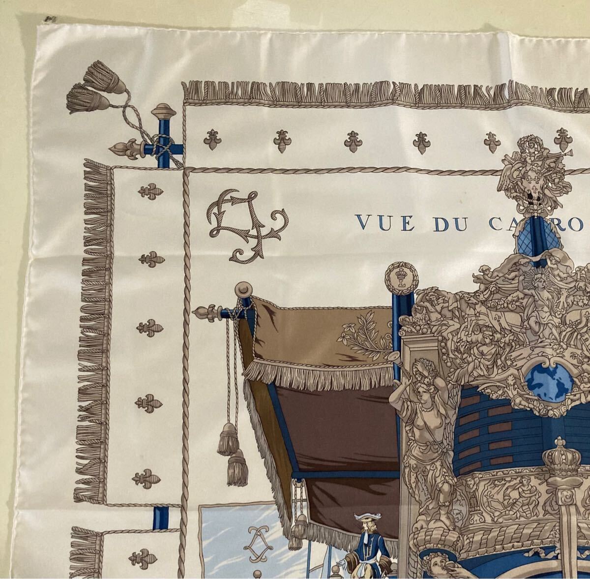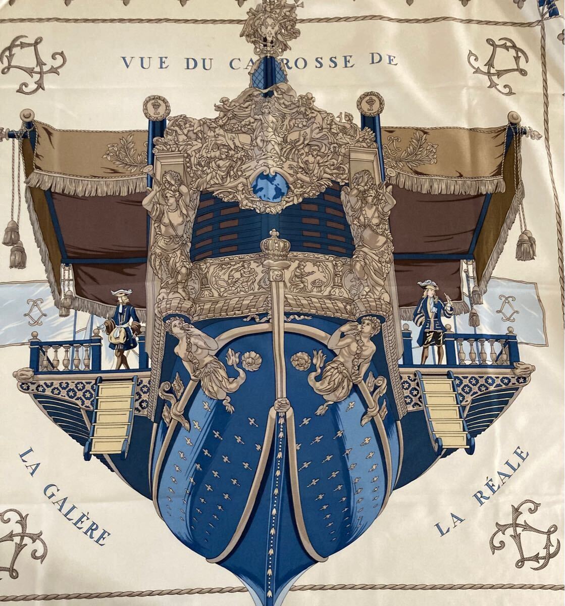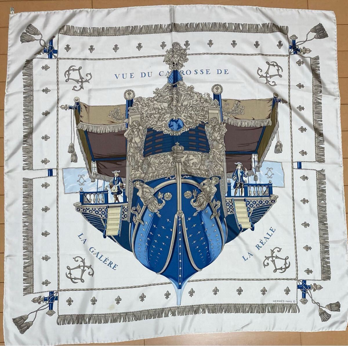 HERMES エルメス 良品★ VUE DU CARROSSE DE LA GALERE LA REALE クイーンの戴冠式 大判 スカーフ ショール マフラー 船 ホワイト カレ90