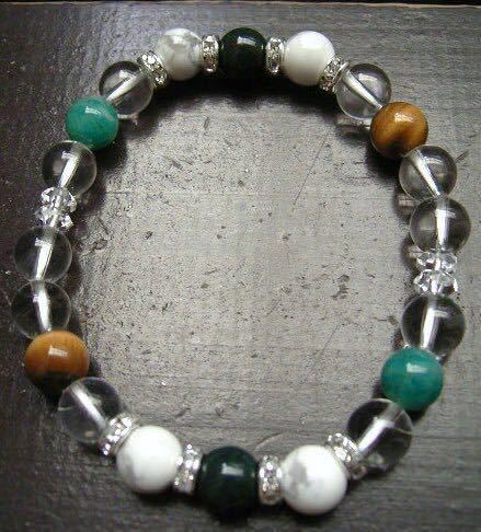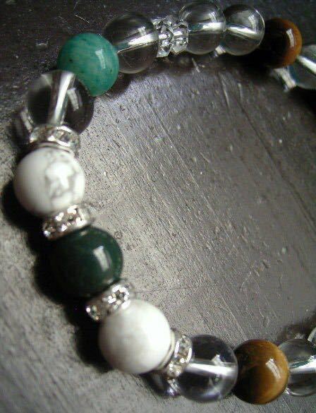 主石は水晶に六白の白にハウライト、中央に金星を司るブラッドストーンを配し、行動力、積極性を促すタイガーアイ、明るさ、気楽さ、コミュニケーション能力を高めるアマゾナイトをあわせました。