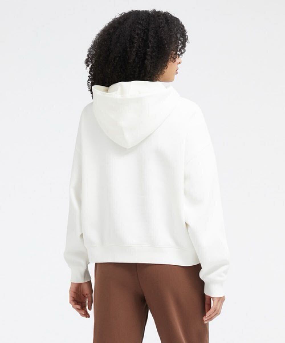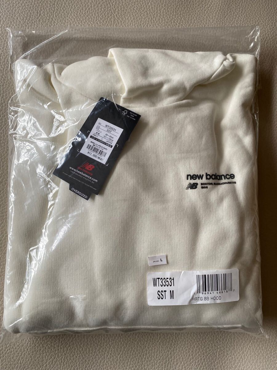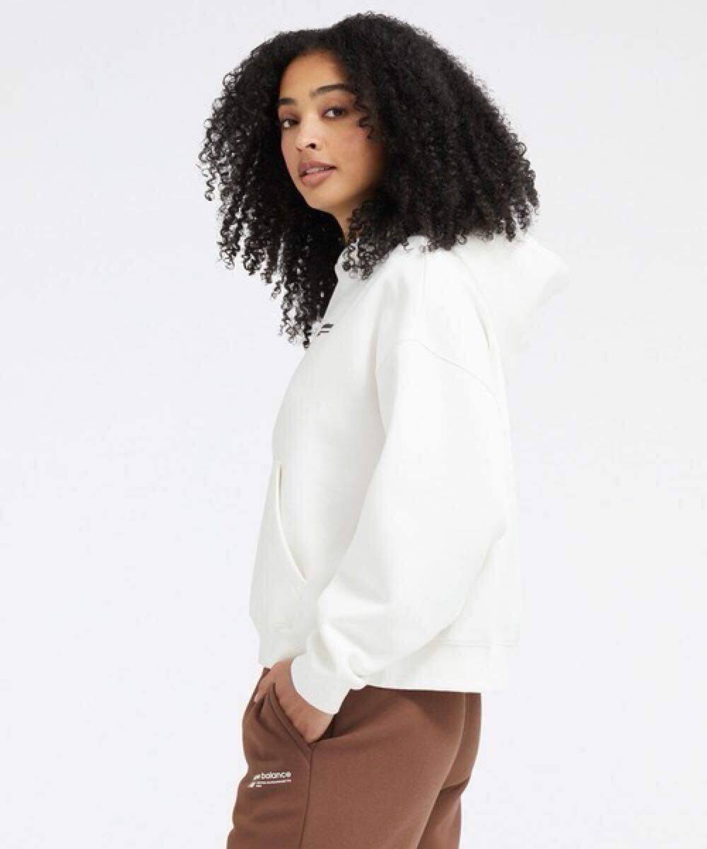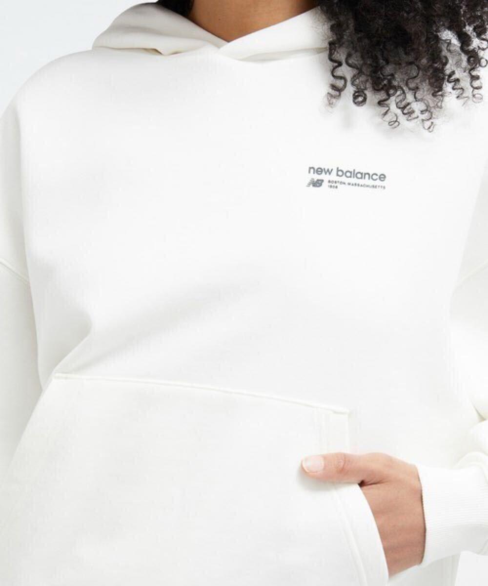 Linearロゴをミニマルなデザインに仕上げたNB Essentialsの裏起毛スウェットフーディー。