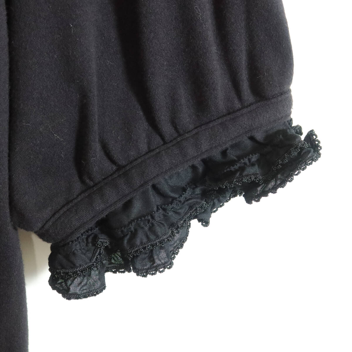 | 商品説明 |                  【実寸約】肩幅40袖丈25.5バスト88着丈54(cm) 【サイズ表記】 M 【素材】 綿100% 【状態】普通の使用感のあるお品物 全体に毛羽立ち、色あせ感あり 【デザイン】黒系 カットソー素材の半袖カーディガンです。 厚手/無地・リボン&ローンの段々フリル付き ポケットあり  |
