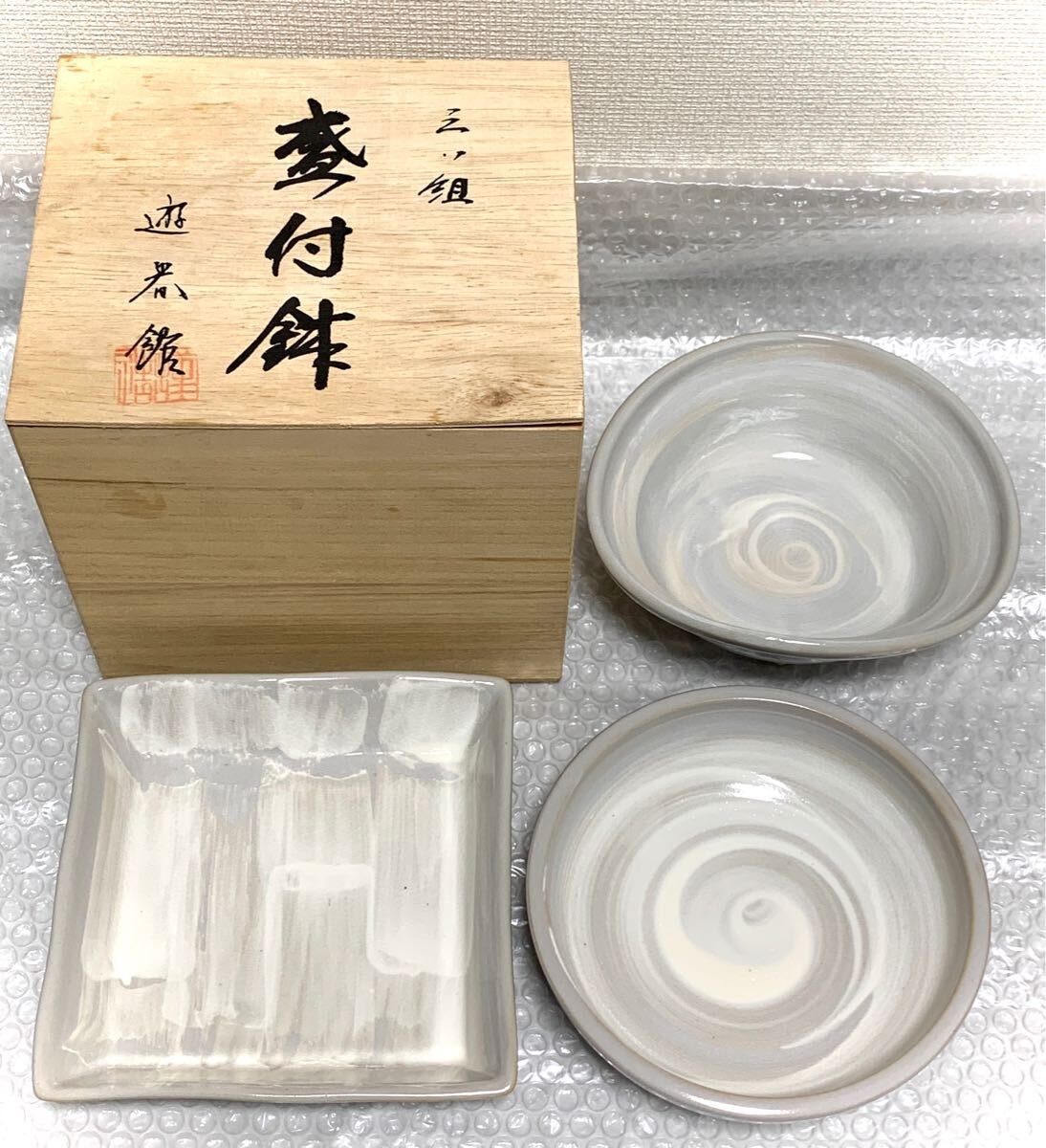 画像には木箱も写っていますが長期間、未使用のまま保管してあるので木箱は外側と内側に汚れと匂いがありるため皿3点のみの発送となり木製の箱は同梱しません。