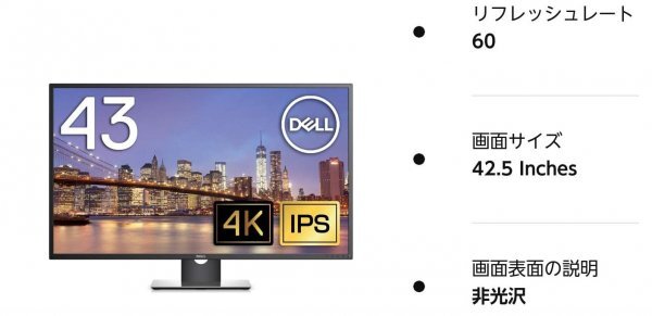 【良品】DELL P4317Q 4Kモニター 43インチ 広視野角/IPS非光沢/DP,mDP,HDMIx2,D-Sub15ピン