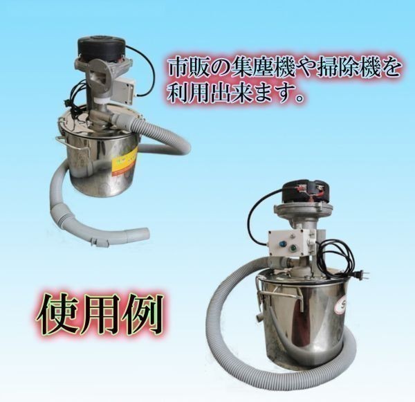 【仕様】 口径32mm アルミ合金製(アルミ鋳物)外形寸法 32mm:135*105*200 重量 450g 風量 32m3/h 静圧 32mm:2kpa 市販の掃除機や集塵機に取り付けてペール缶や一斗缶 ドラム缶 などの容器に吸い込んだ物を集めるようにできます。容器の中にゴミ袋を入れておけばそのまま袋ごと捨てる事ができて面倒が無く便利に使用できます。色々なものを吸い込んで収集することができます。木くず おがくず 野菜くず 砂 落ち葉 芝生 ほこり 石 砂利 鉄くず 切削くず セメント コンクリート モルタル など吸い込んで掃除できます。 | |||