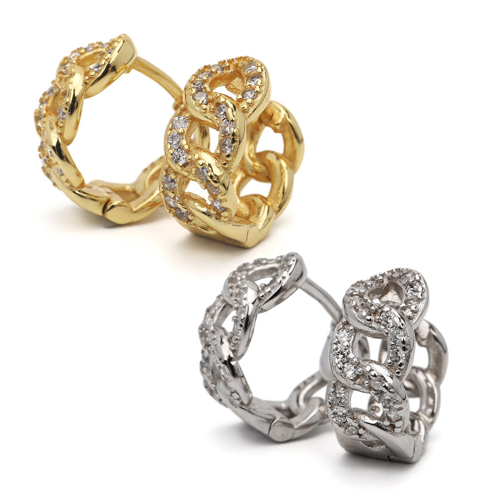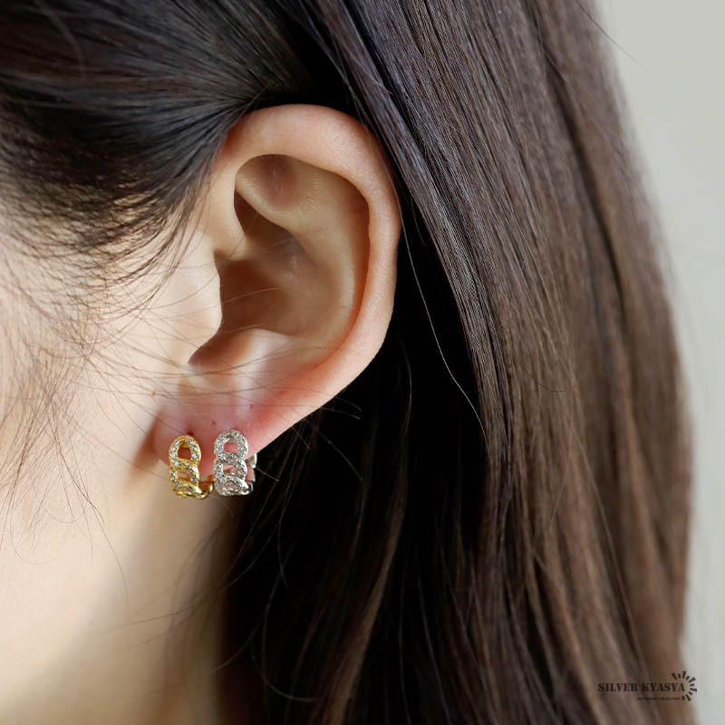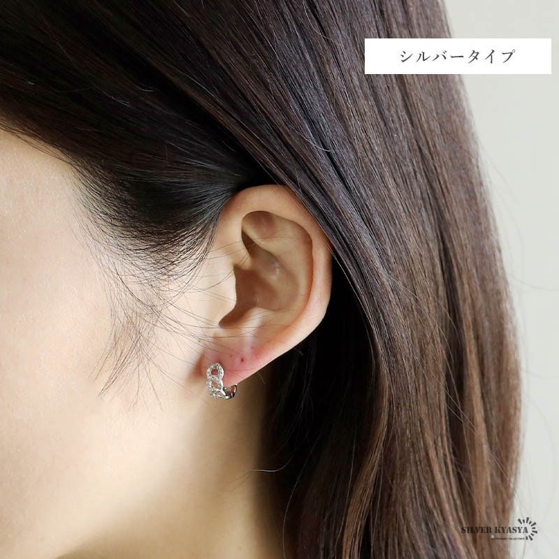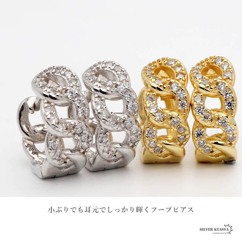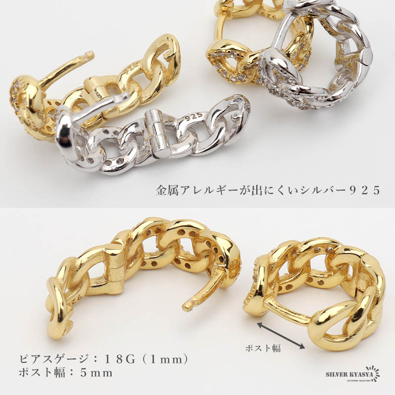 小ぶりながらも耳元でしっかりと輝くユニークな喜平チェーンデザインのフープピアス。ゴールド/シルバーの2カラーから選べます。両耳用2点セットでお届けします。