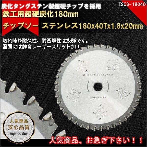 全国一律【送料無料】2枚セット チップソー 鉄工用 180mm 刃数40T 内径20mm 超硬炭化タングステン 鉄 ステンレス 切れ味 耐久性高い