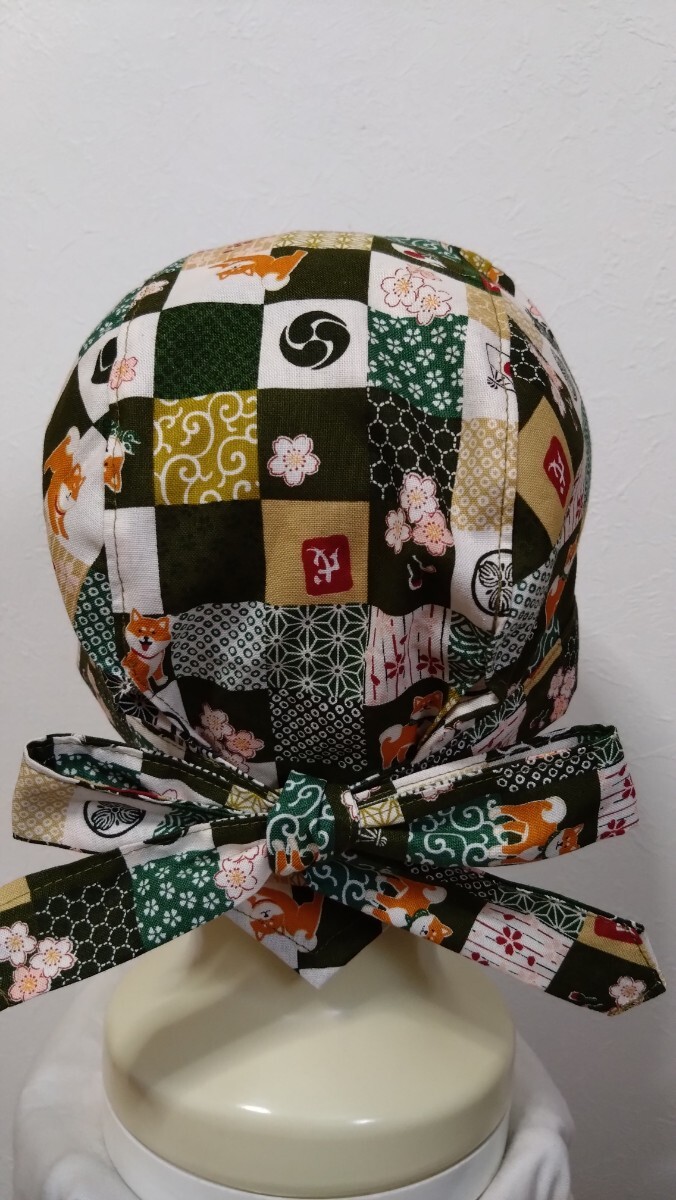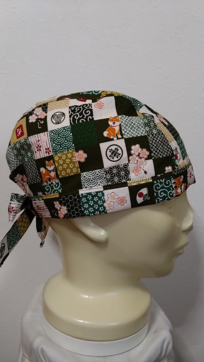短★バンダナキャップ★ハンドメイド 和柄 唐草 柴犬 市松 パッチ 緑