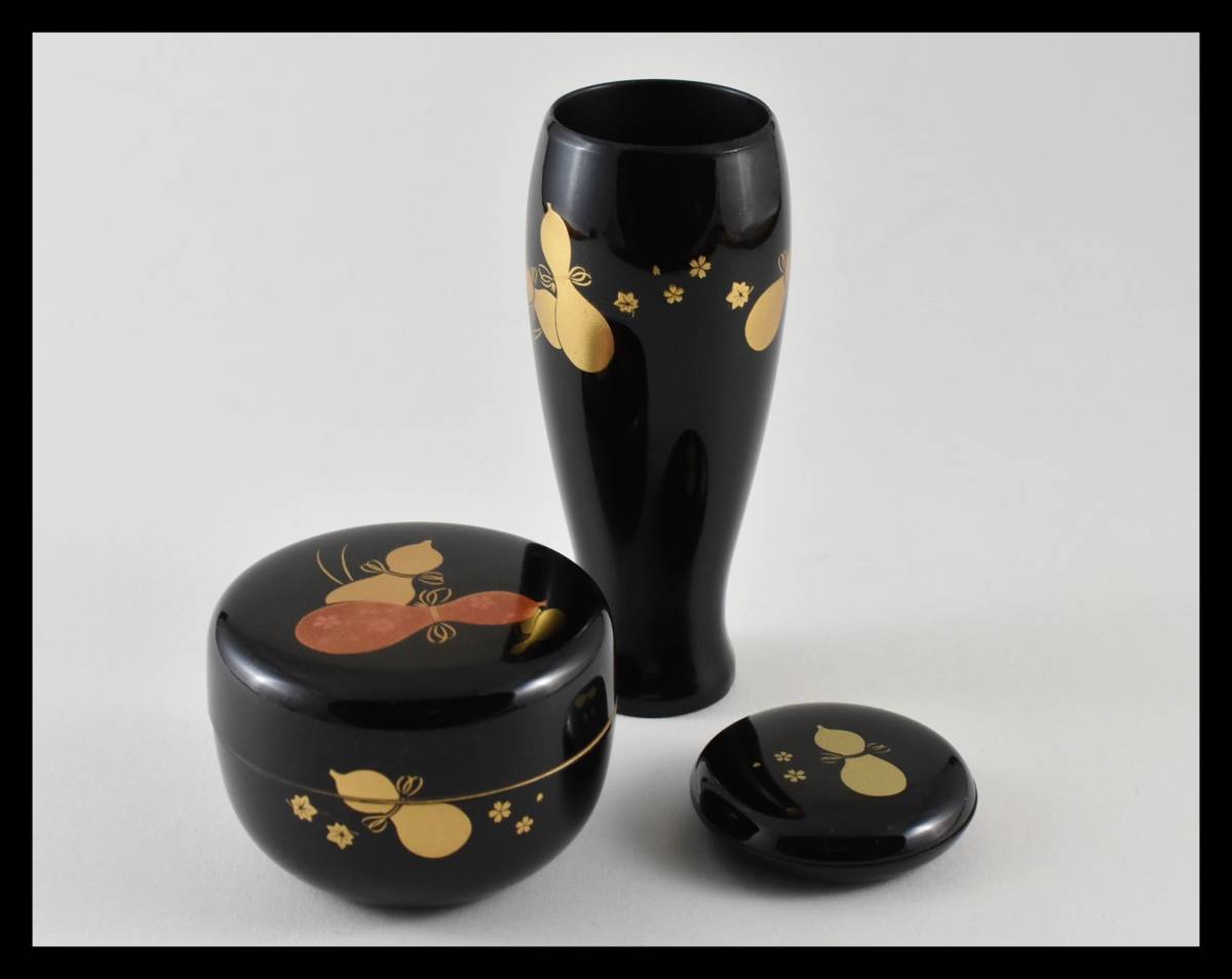 ▲楠廸庵▲茶箱用塗三点セット 瓢蒔絵 黒塗 樹脂製 茶道具