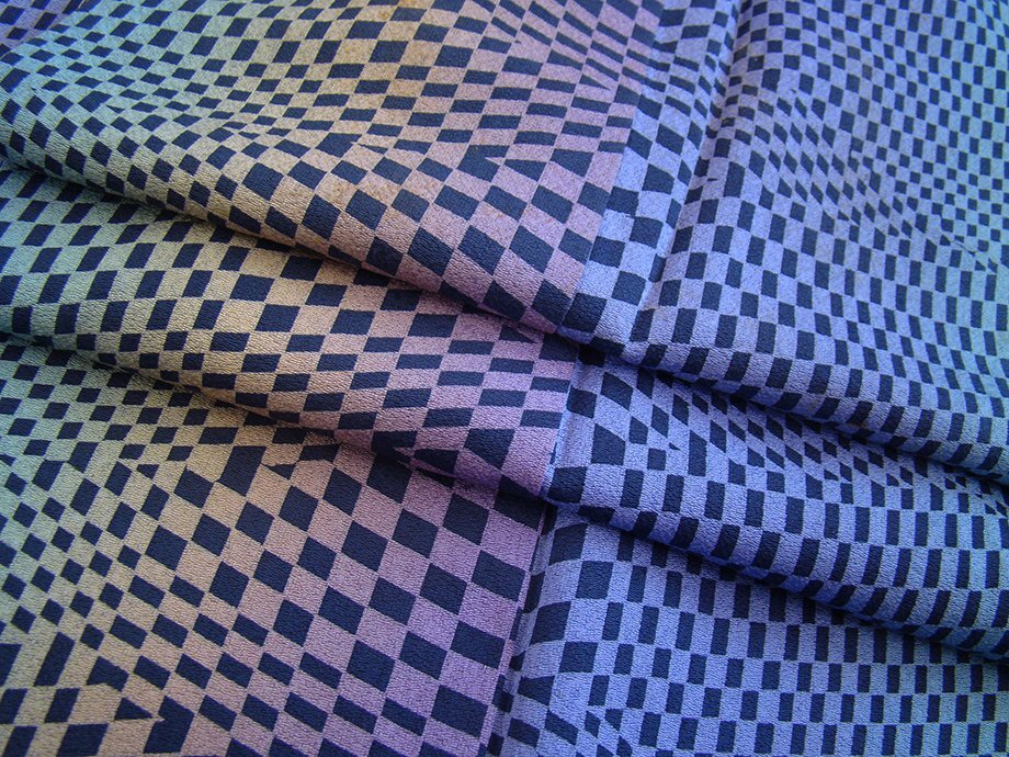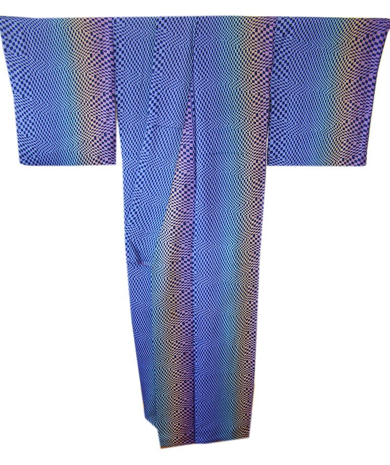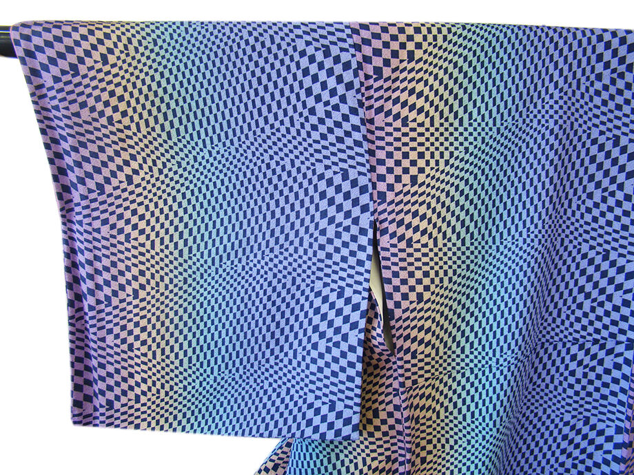| 商品説明 | こちらのお品は「袷」ですので10月から5月までお召頂ければと思います。 しなやかで滑らかな手触りの着心地良い重めの極上ちりめん地の生地、 紫、黄、緑、青藤色のぼかし地に藍鉄色の角柄の染柄、 八掛は葡萄色(正絹)、身幅細め、幅広い年代の方にお召頂けます。 |