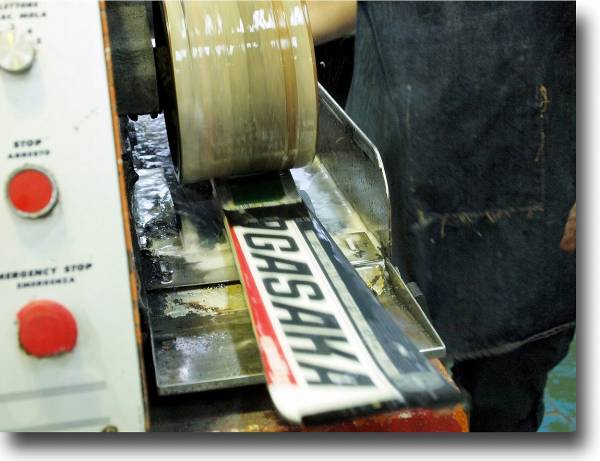 ●滑走面のノーズからテールまで均等に研磨し、ダメージのある古い滑走面を取り除きます。古くなった表面 を薄くスライスするイメージです。スライスの厚みはソールやベースエッジのダメージに応じて調整します。凹 凸のあるソールはこの工程で、まずフラットに近づけます。またこの 工程で比較的浅いすりキズ、線キズを取り除きます。熟練を要する重要な工程です。 |