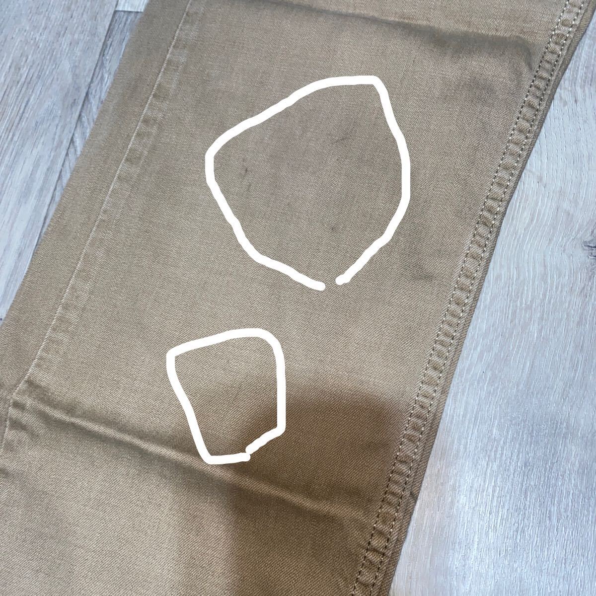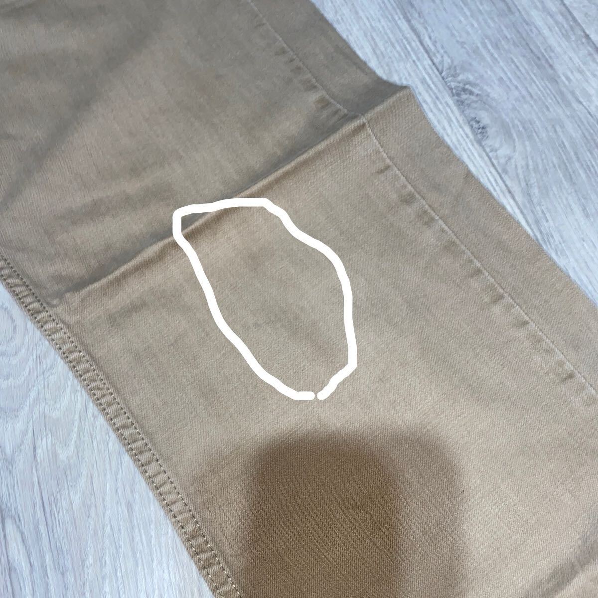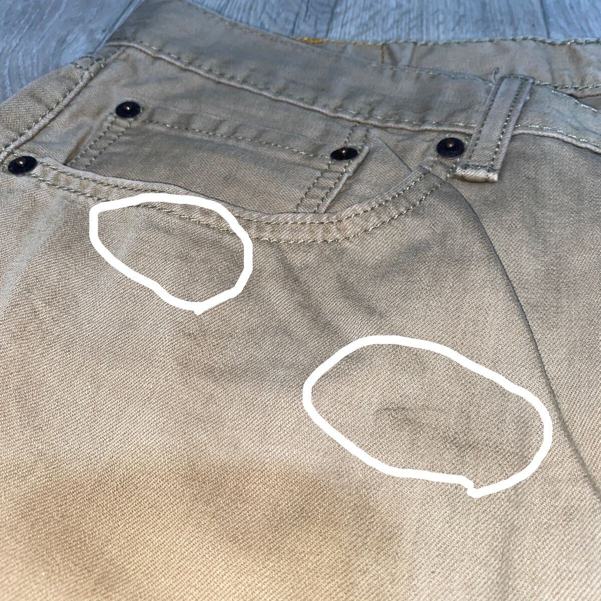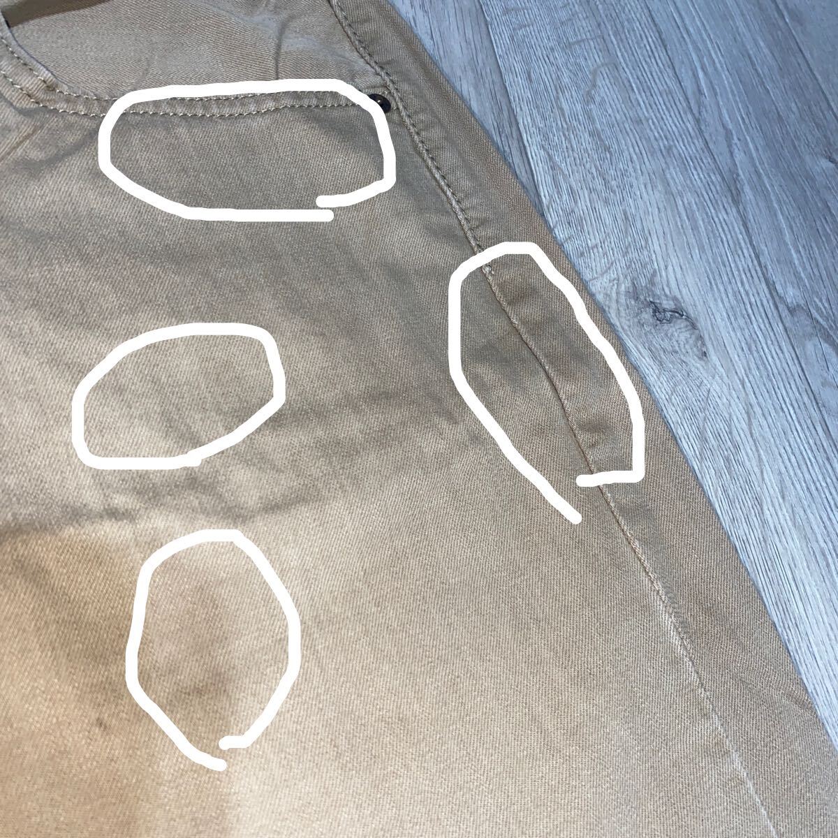 ダメージは、右ポケット下、両もも、両ひざなどにシミ汚れがあります。(画像)