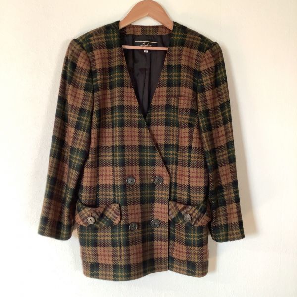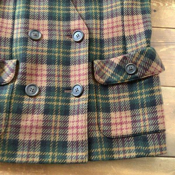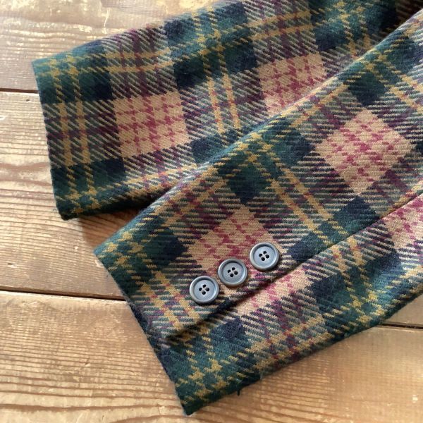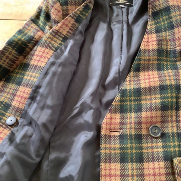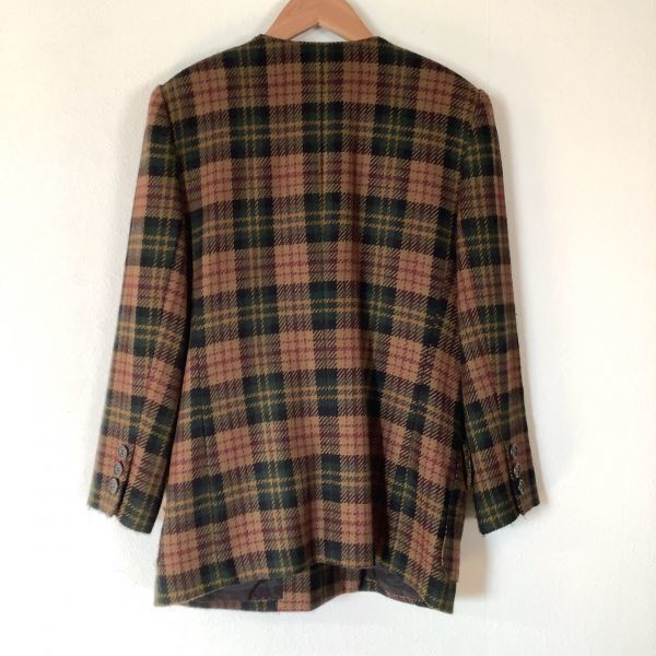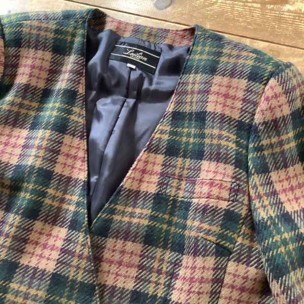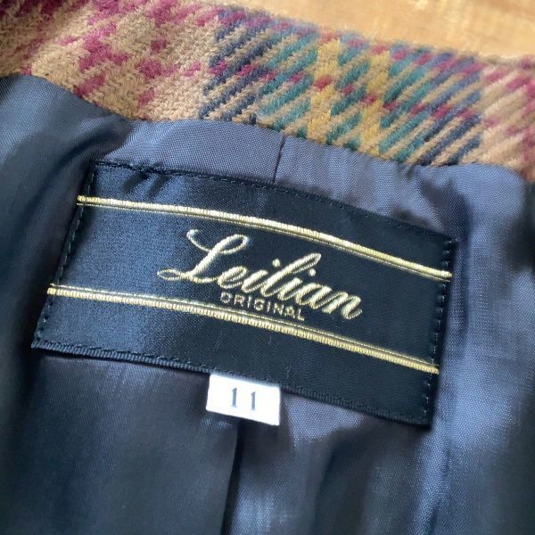 【高級ドイツ製 otten 生地】極美品 Leilian レリアン ノーカラー チェック デザインジャケット レディース 11号 ブラウン グリーン