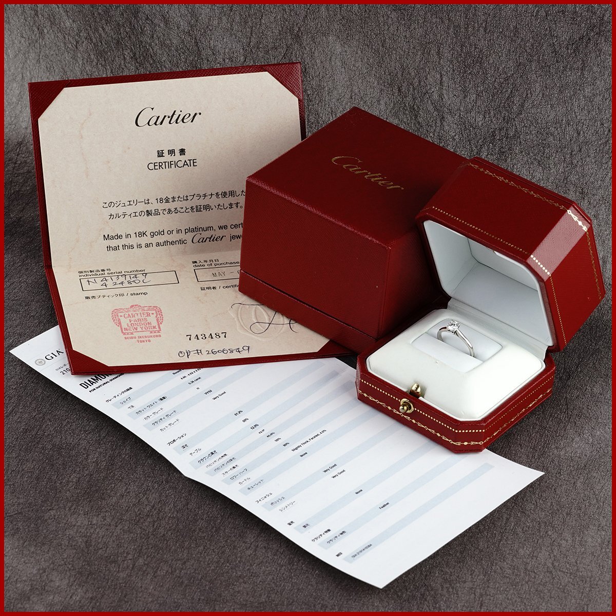 | 付属品 | リング本体、内/外ケース(若干傷あり)、ギャランティ、GIAダイヤモンド鑑定書(プリント) |