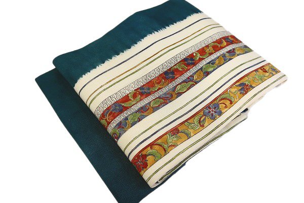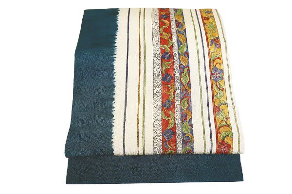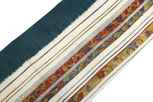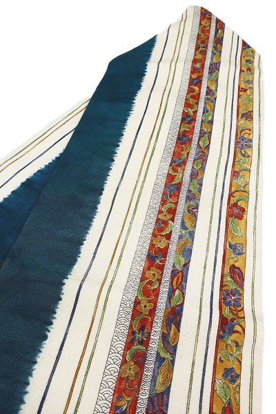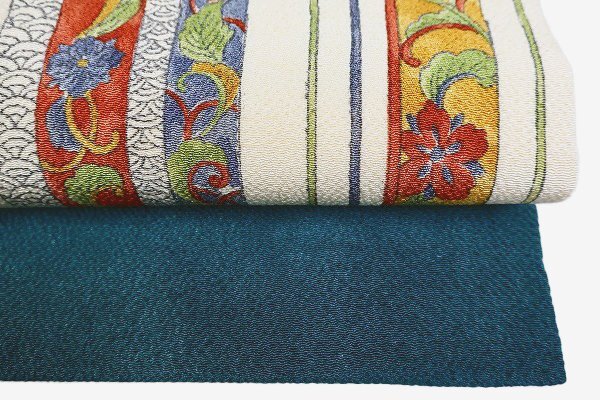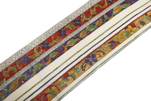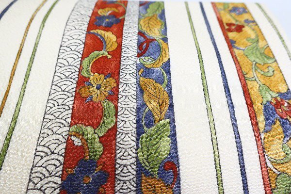 | 【着物フィ】名古屋帯 縮緬地 アイボリー 縦縞 唐草花 青海波 3m54cm お洒落 普段着 カジュアル 正絹 仕立て上がり m-7288 |
