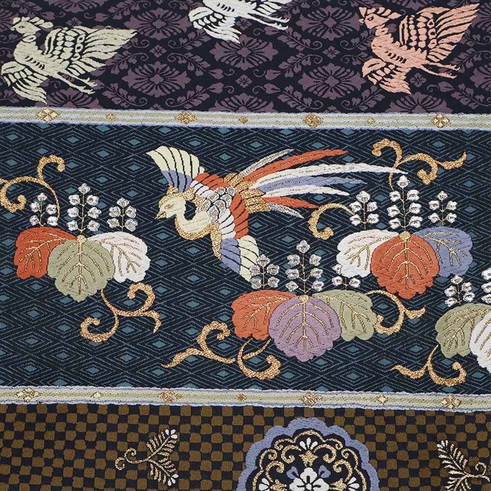 西陣織袋帯 唐織 名物裂 紫・緑・金・茶・黒地 唐織・鳳凰・花喰鳥・桐・唐花・華文 (写真では上手く色が出ない場合があります。ご了承下さい) ※お使いのディスプレイの種類や設定の差により 実物の色と画像の色が少々異なることもございます。 |