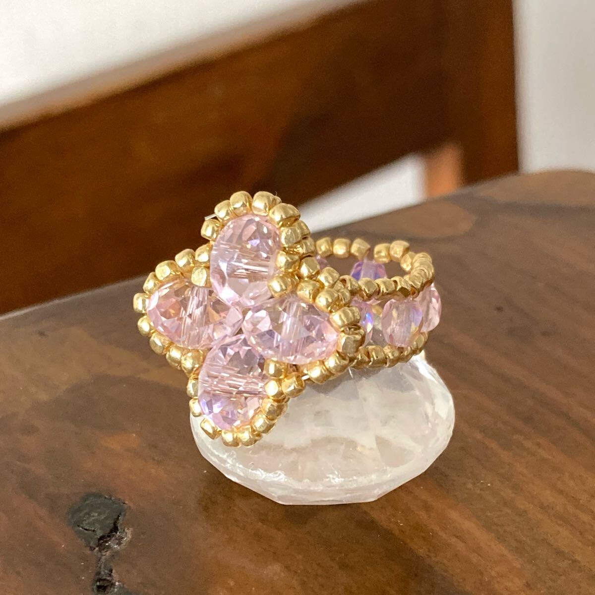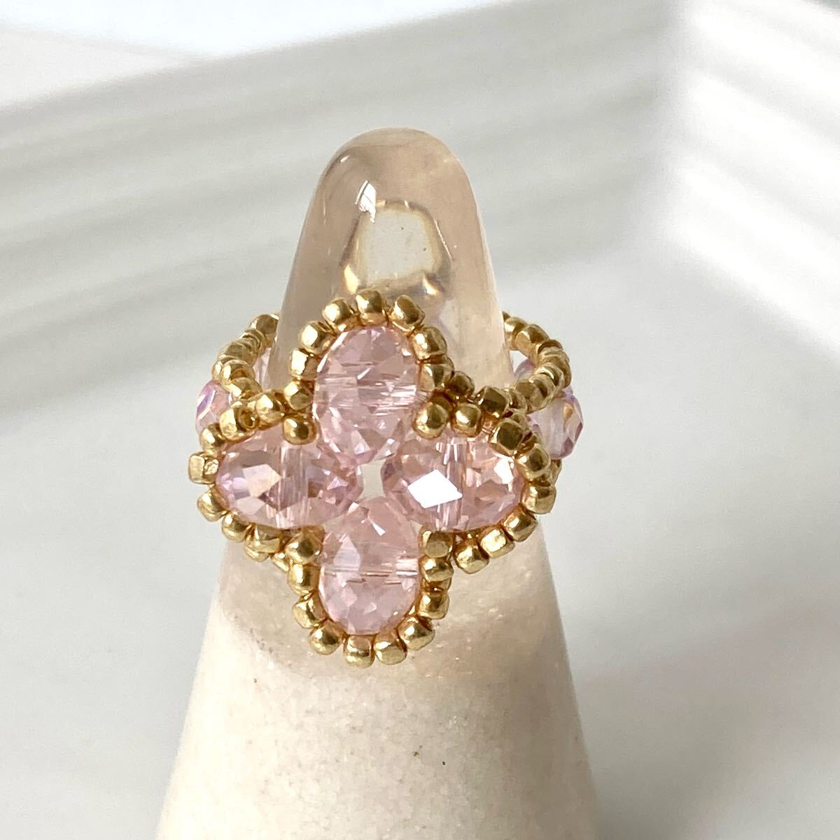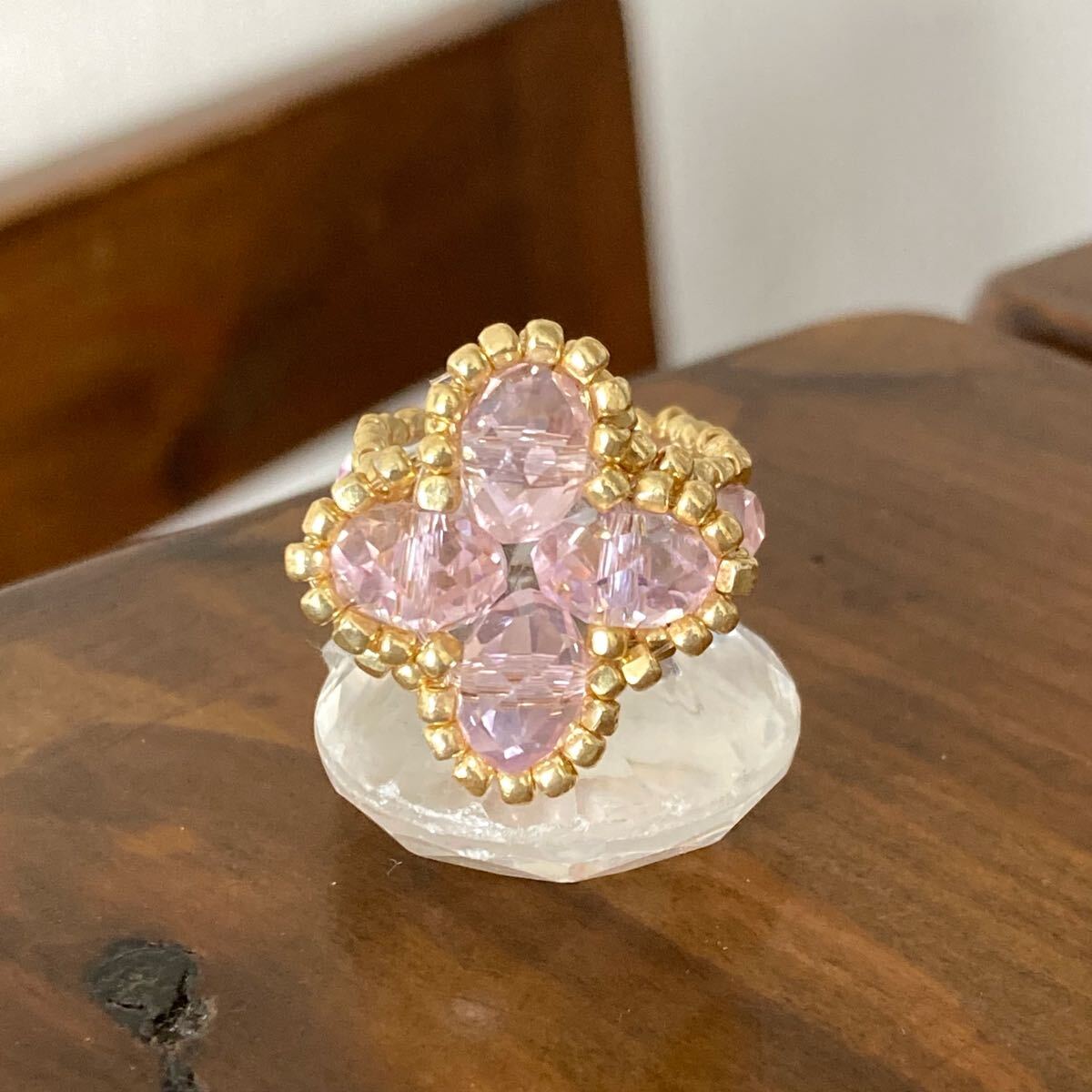 ビーズ リング  指輪 ハンドメイド ボタンカットビーズのクローバー風リング クリアピンク×ゴールド 13-15号です。