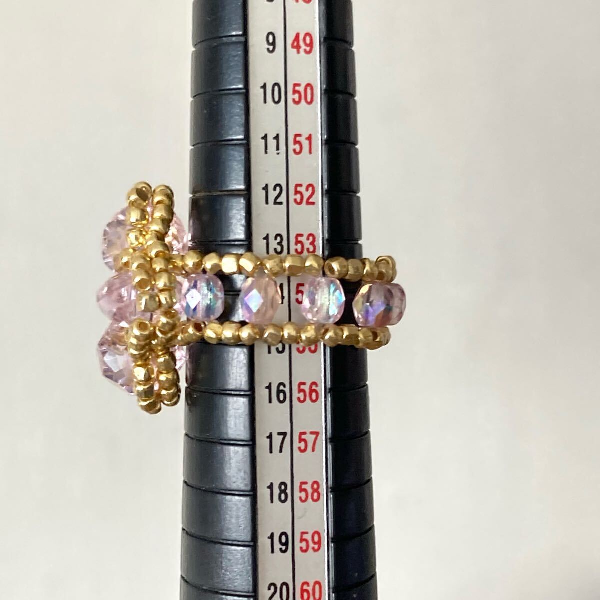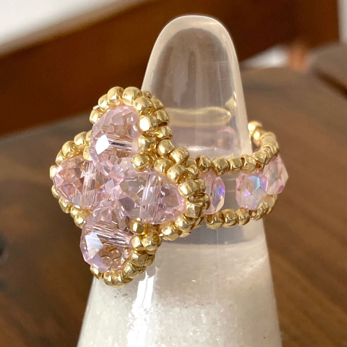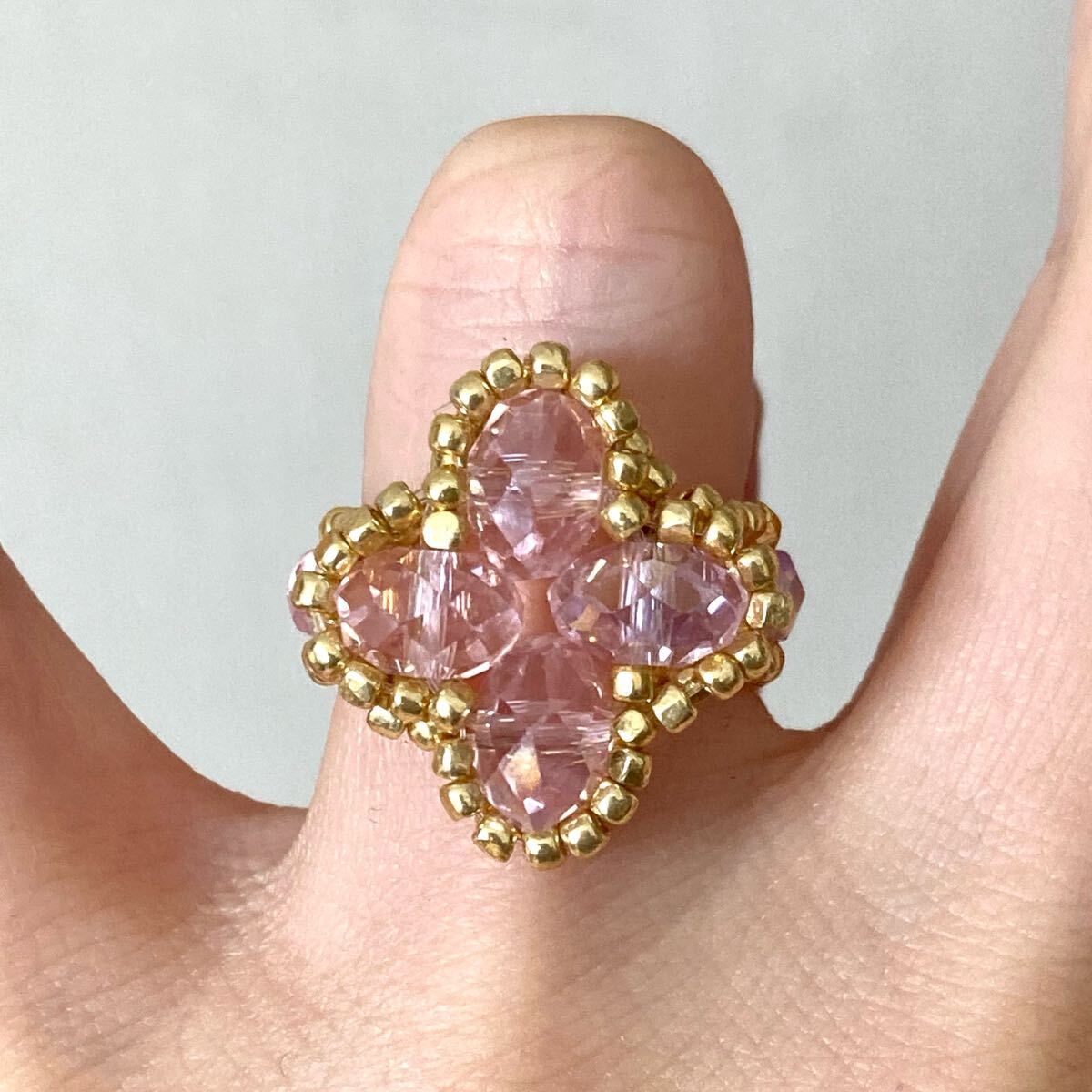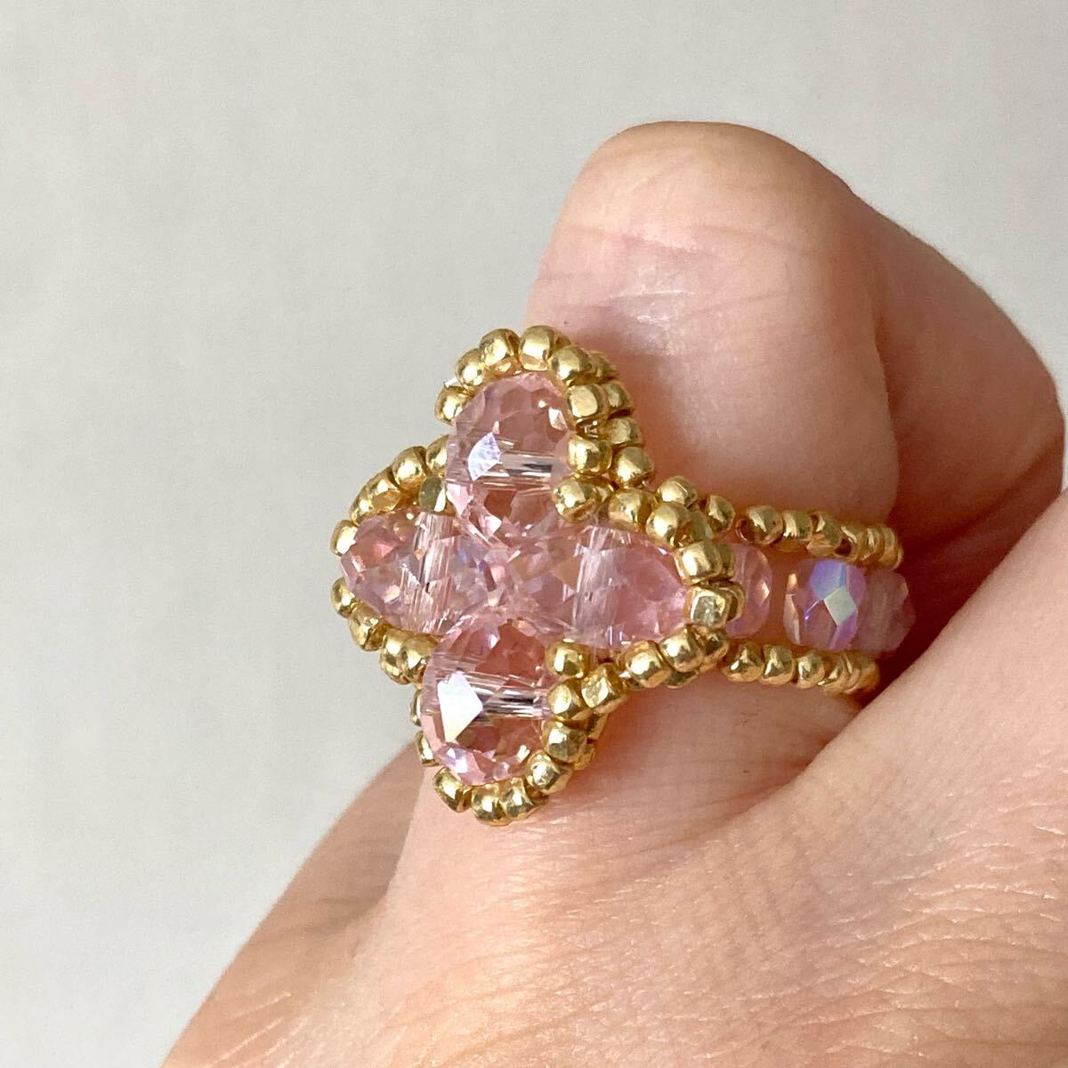 ビーズ リング  指輪 ハンドメイド ボタンカットビーズのクローバー風リング クリアピンク×ゴールド 13-15号です。
