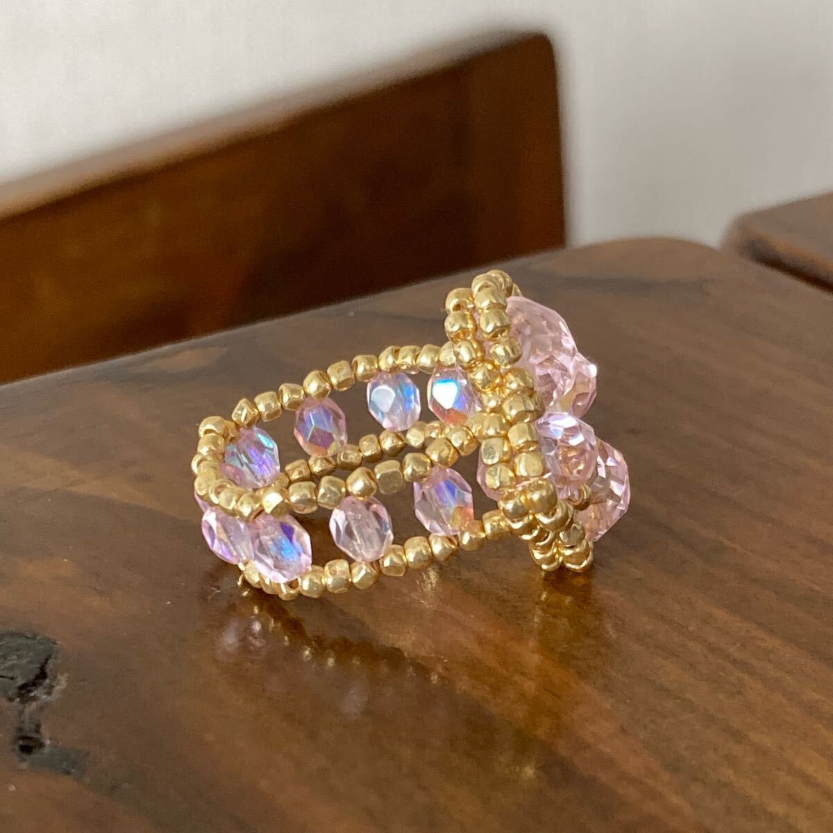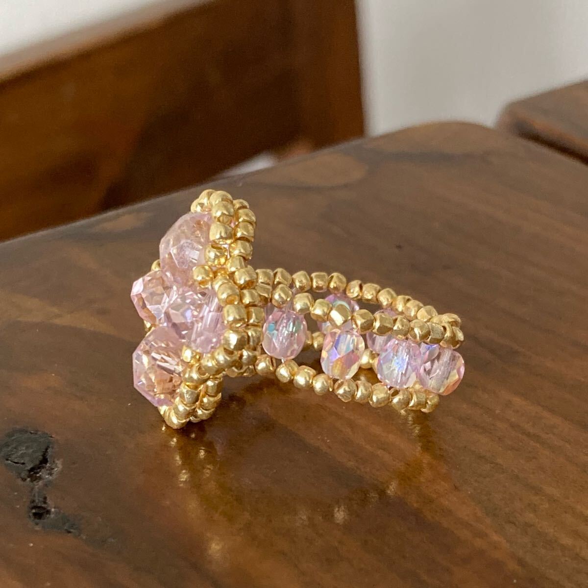 大きめのクリアピンクのボタンカットビーズの周りをゴールドのスリーカットビーズで2重に縁取ったクローバー風デザインのリングです♪