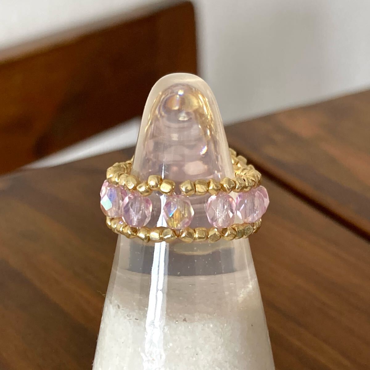 8mmのクリアピンクのボタンカットビーズ、4mmのクリアピンクのチェコビーズ、ゴールドのスリーカットビーズで作ったリングです。