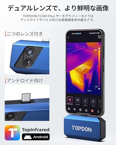 TOPDON TC001 Plus サーモグラフィーカメラ (Android 用)、512 x 384 スーパー解像度 (100W可視光カメラ付き)、256 x 192 IR 解像度、スマートフォン、タブレット、PC 用デュアルレンズ サーマルカメラ (iOS には対応しません)