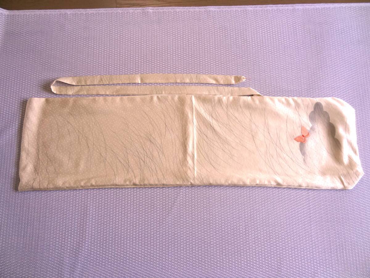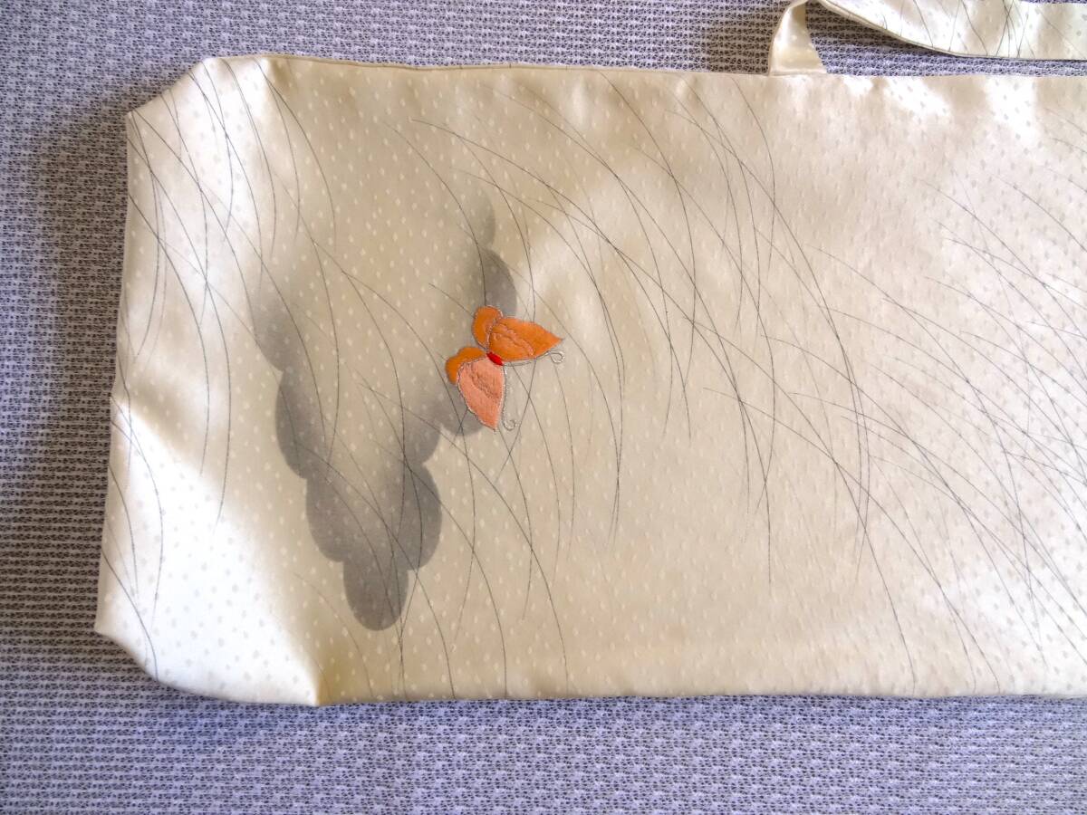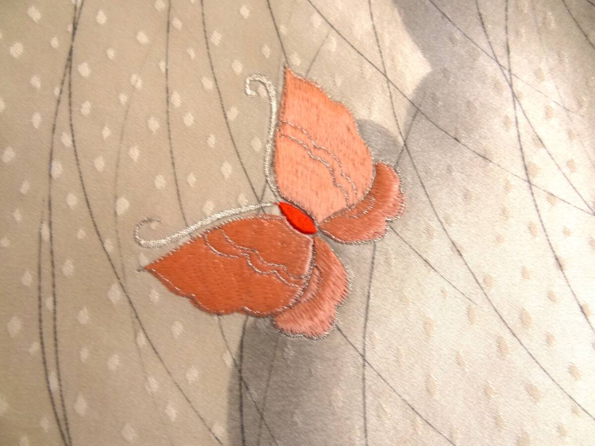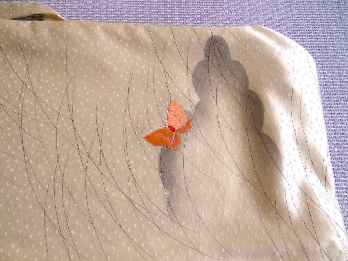 綸子のオフホワイト地に飛び蝶刺繍の付け下げ着物をほどき作りました。