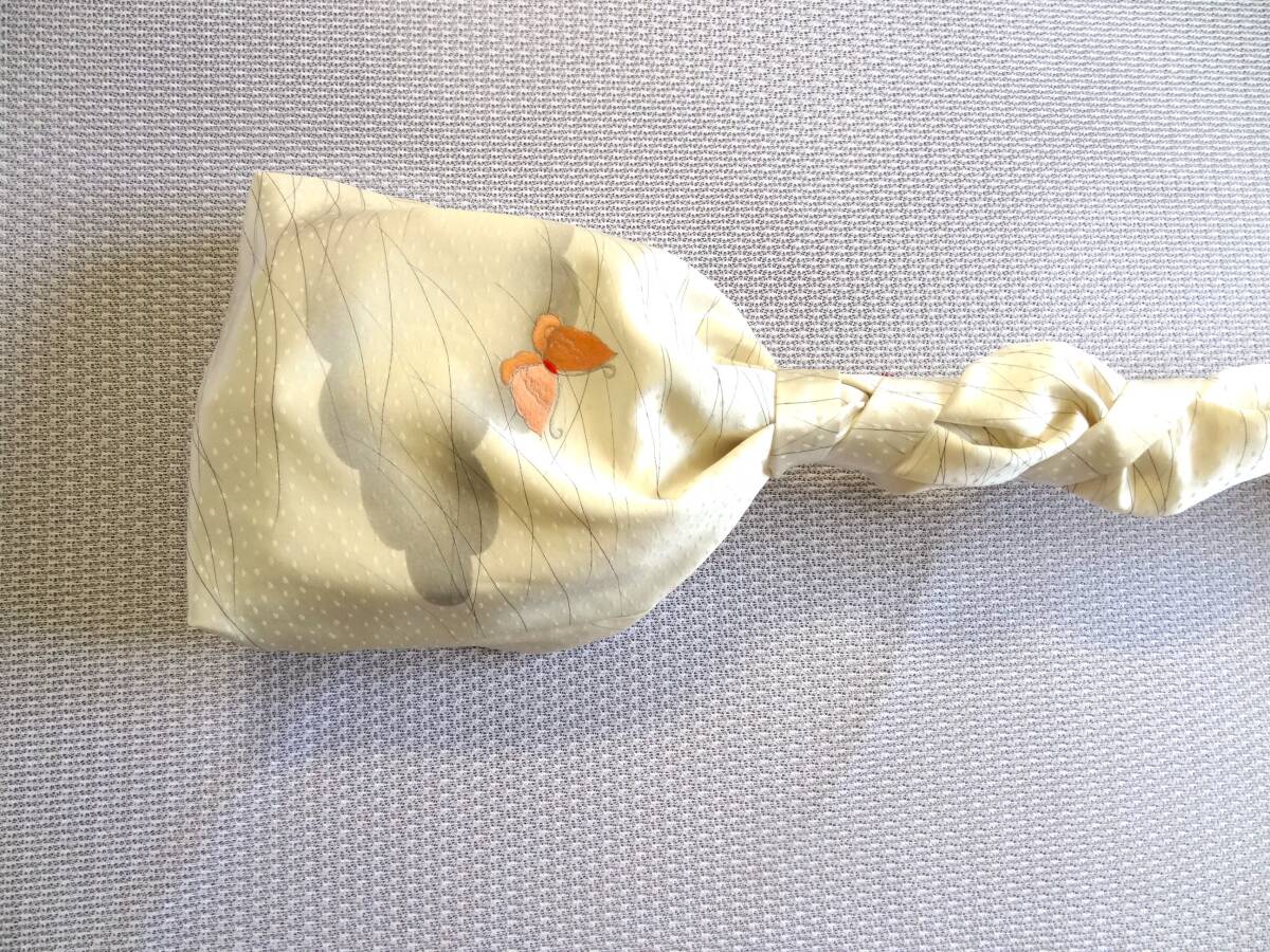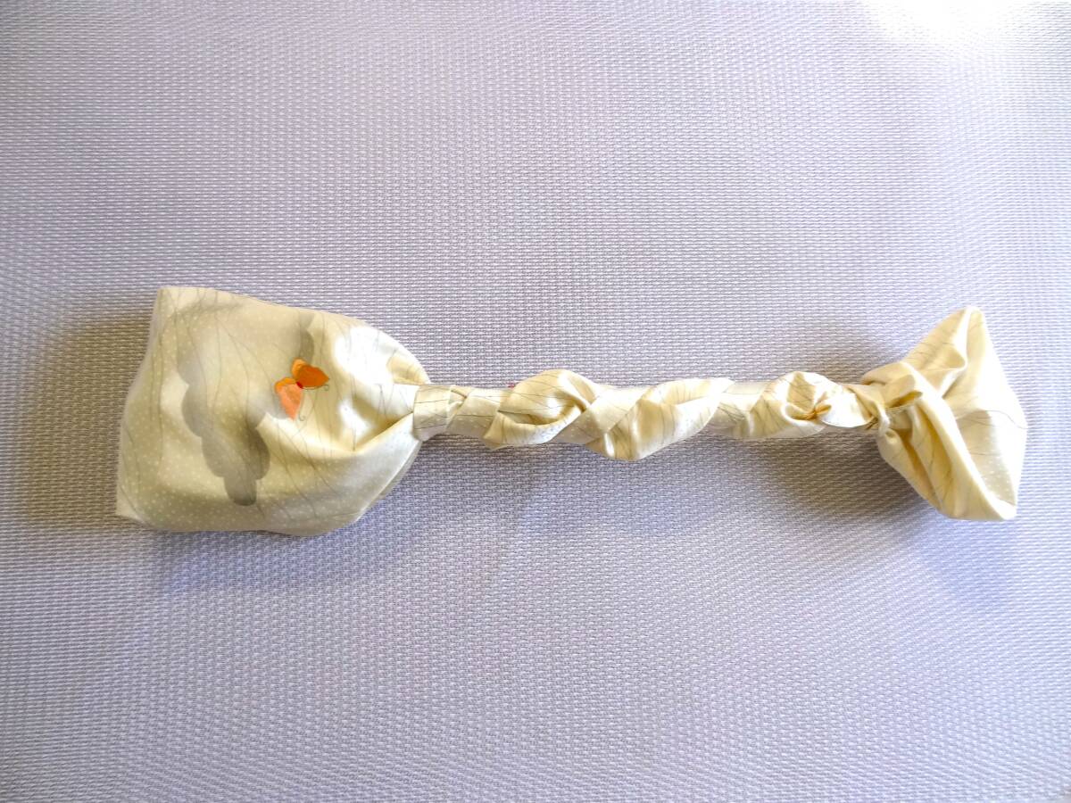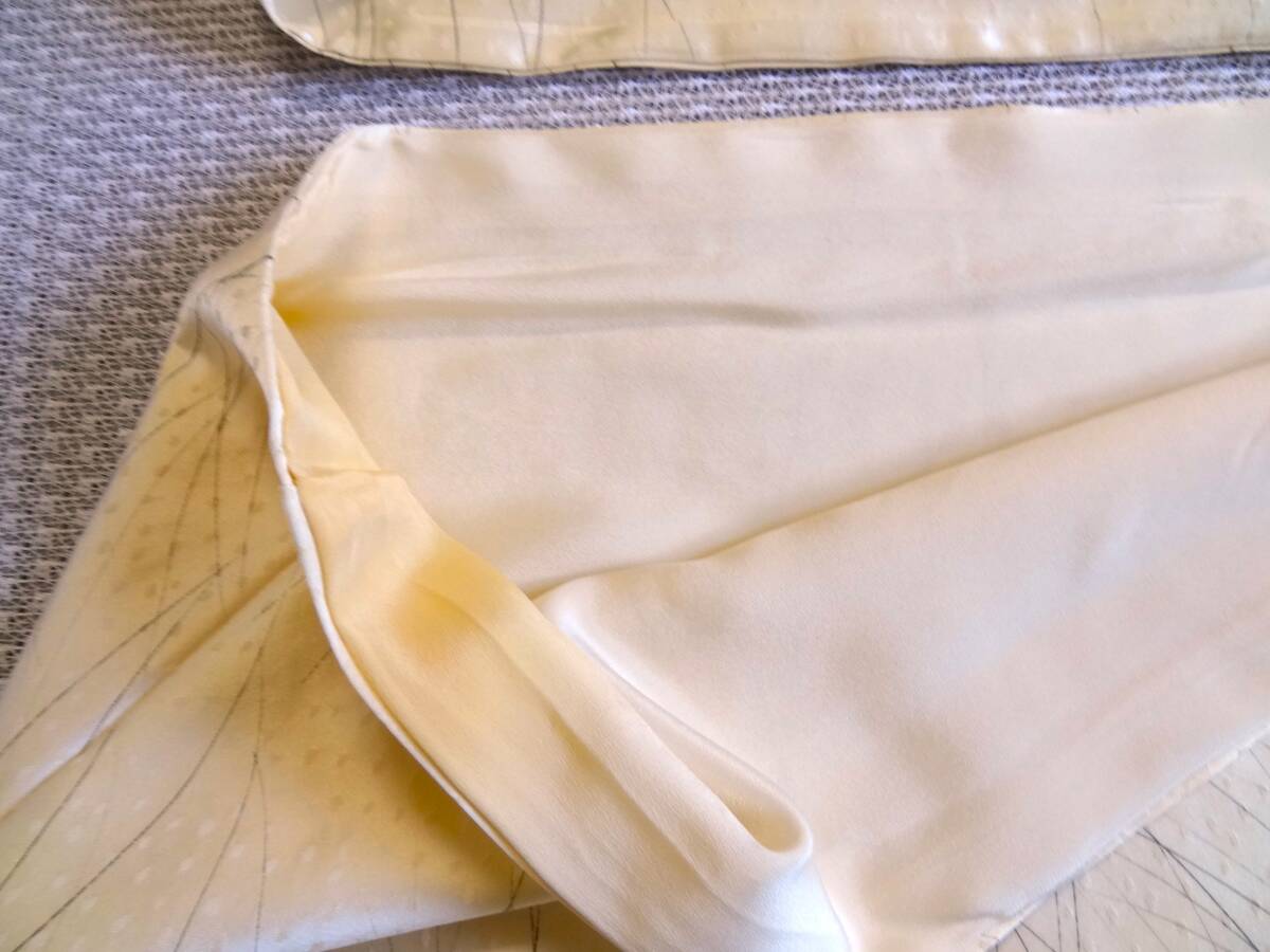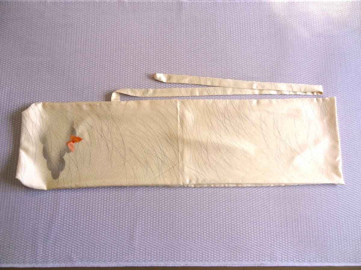 綸子のオフホワイト地に飛び蝶刺繍の付け下げ着物をほどき作りました。