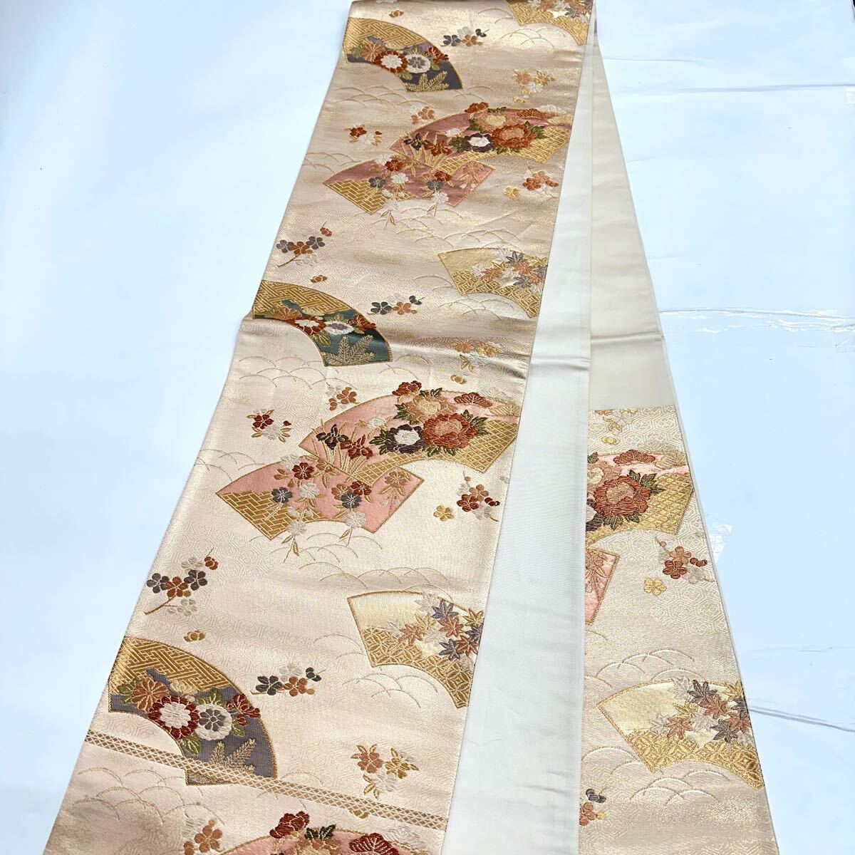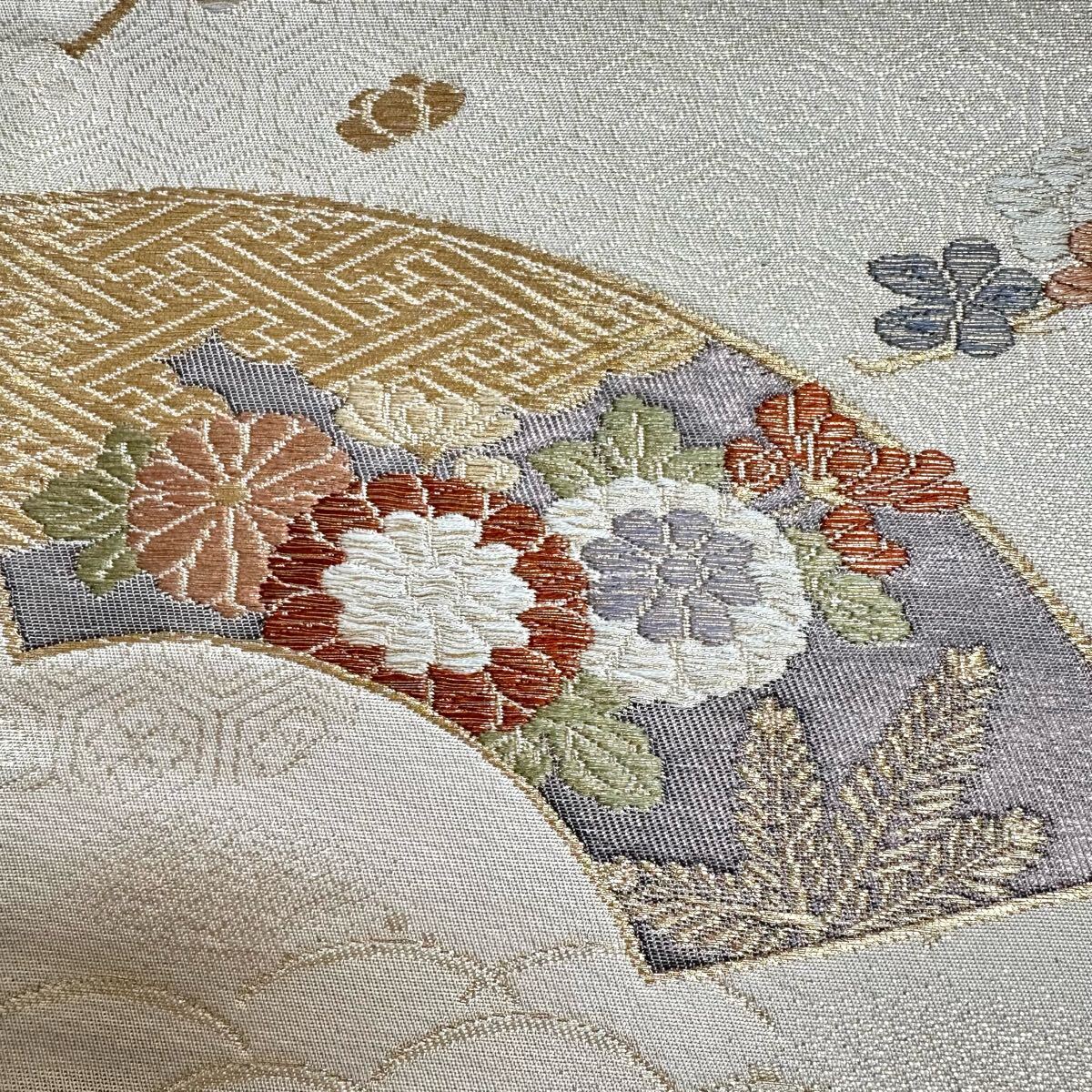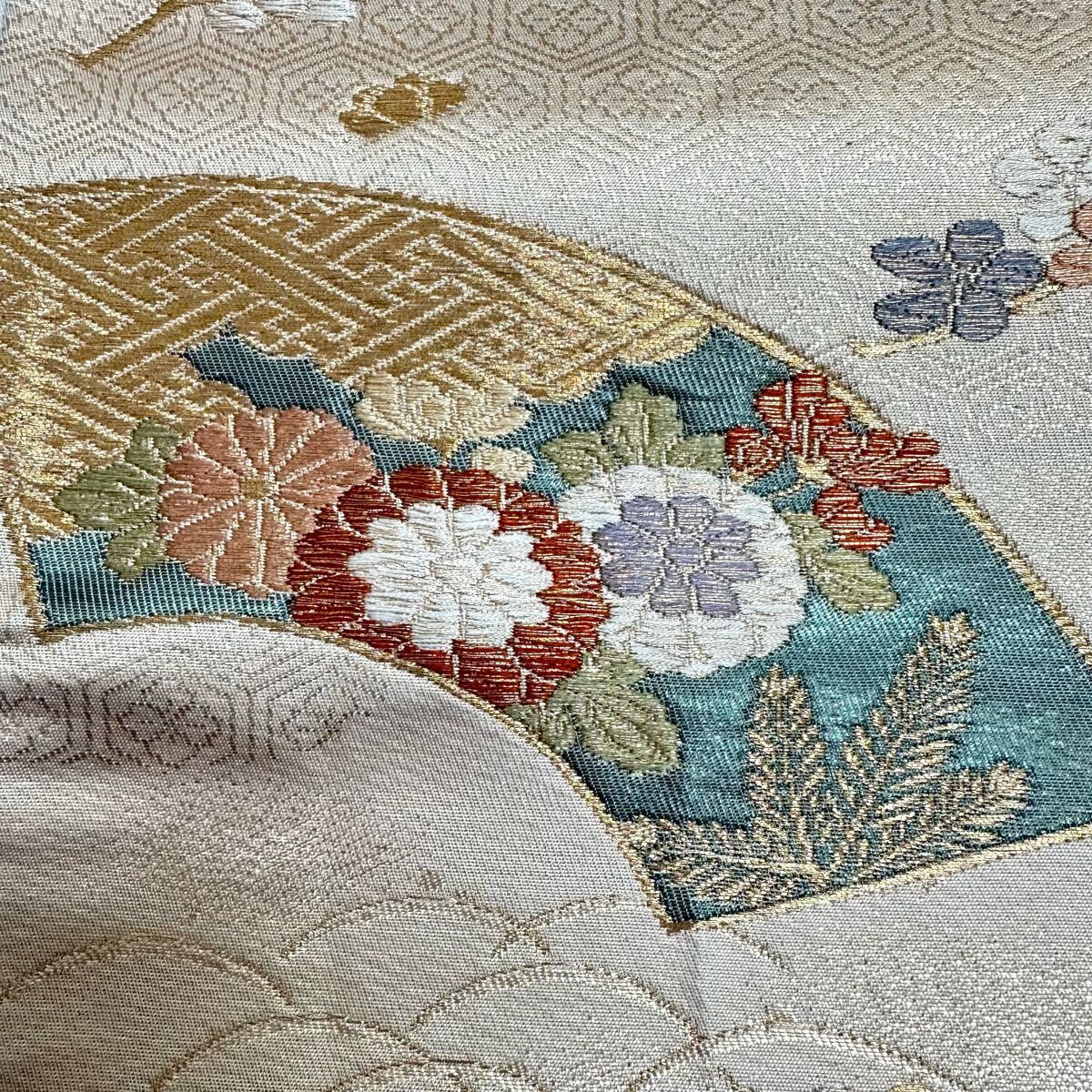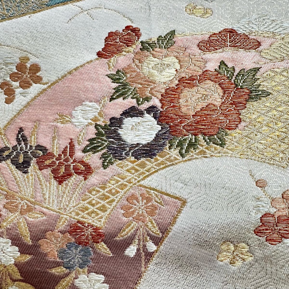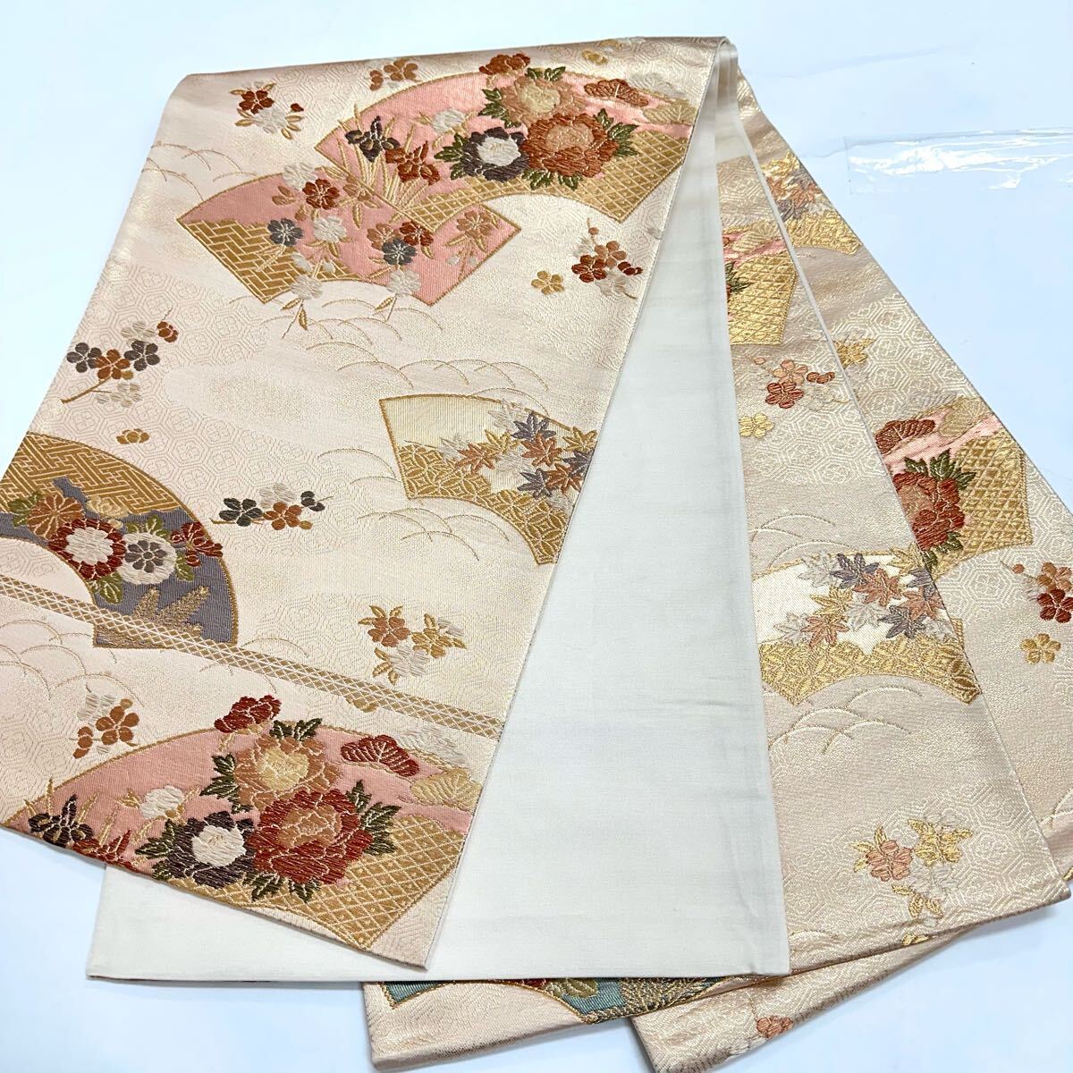 【七福】c471 逸品 高級品 正絹 袋帯 六通 四季花 扇面 金糸 刺繍 豪華