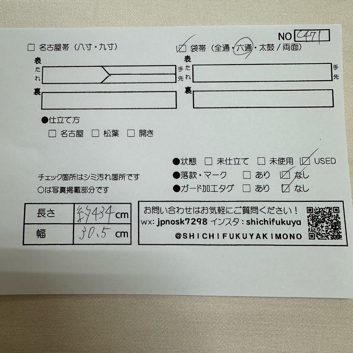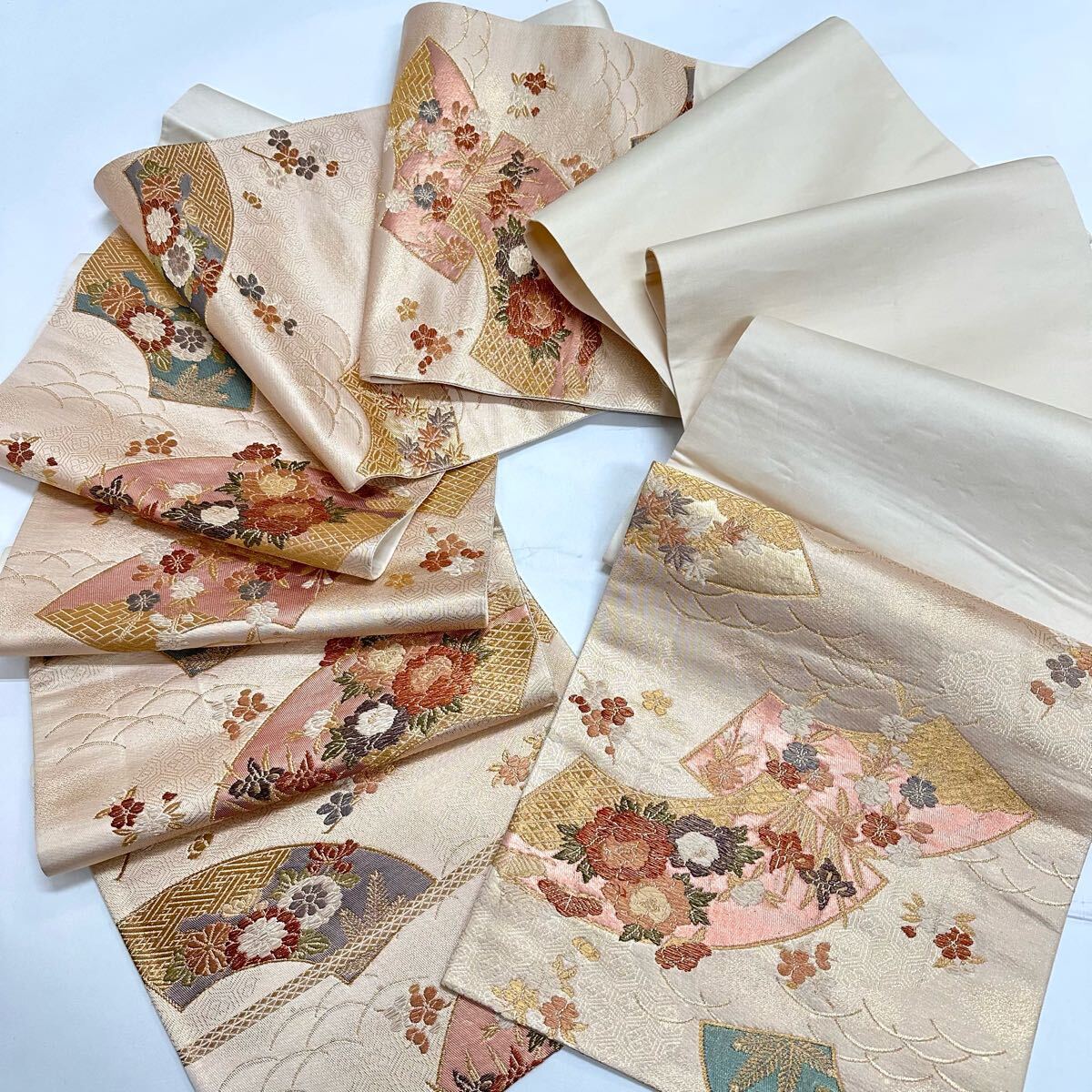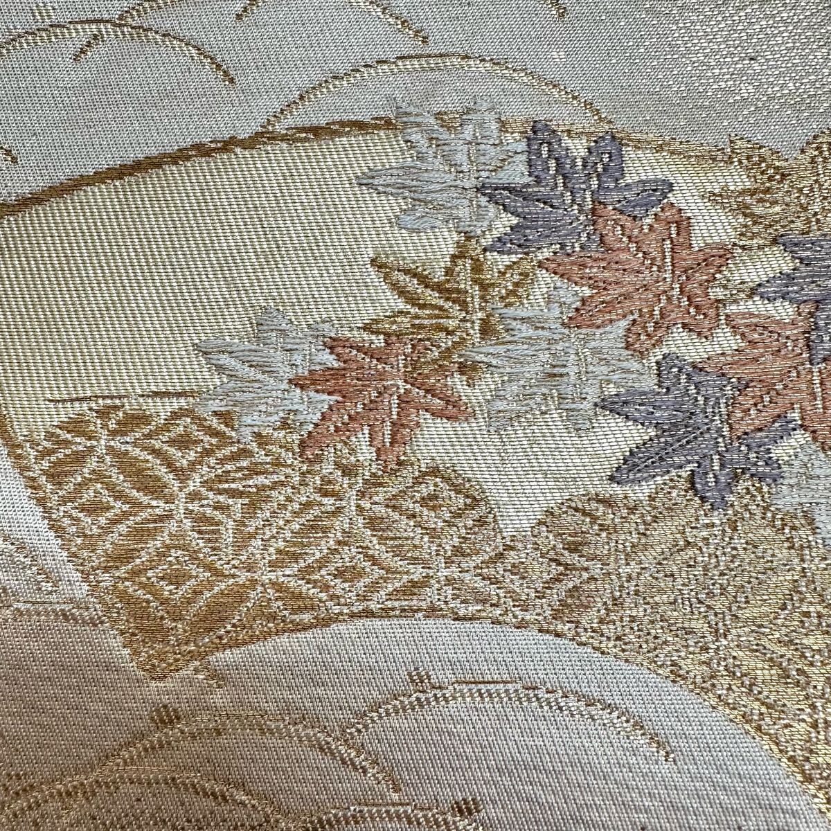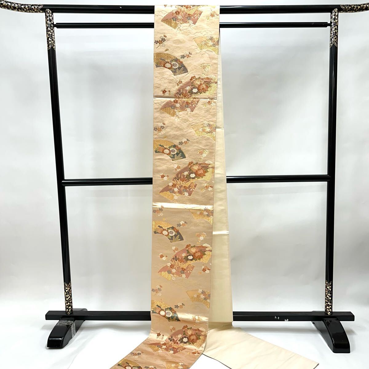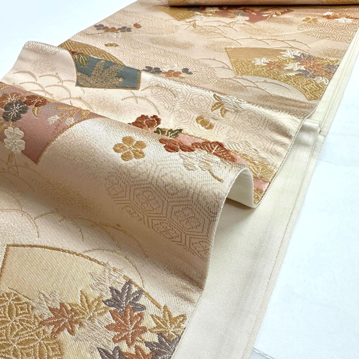 【七福】c471 逸品 高級品 正絹 袋帯 六通 四季花 扇面 金糸 刺繍 豪華