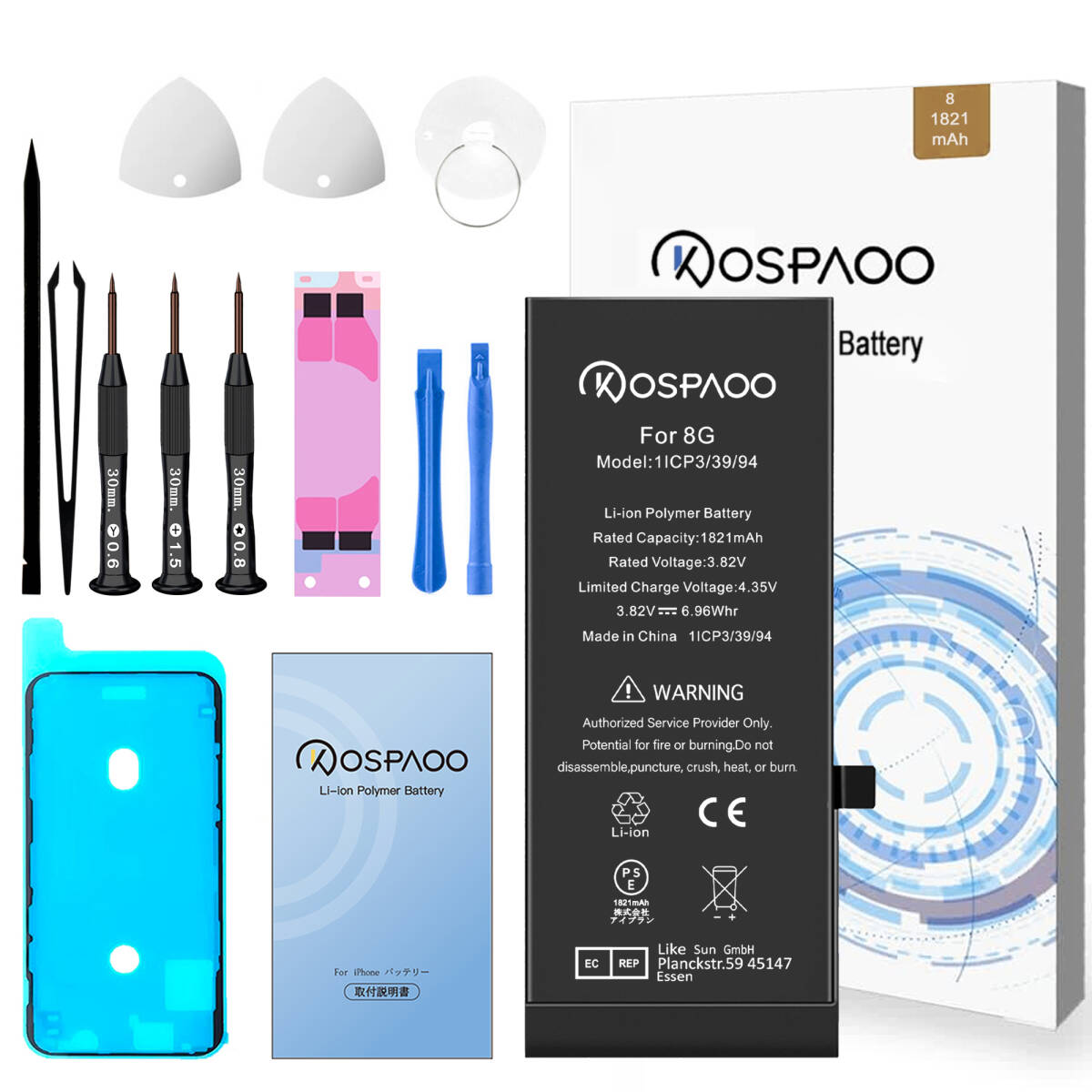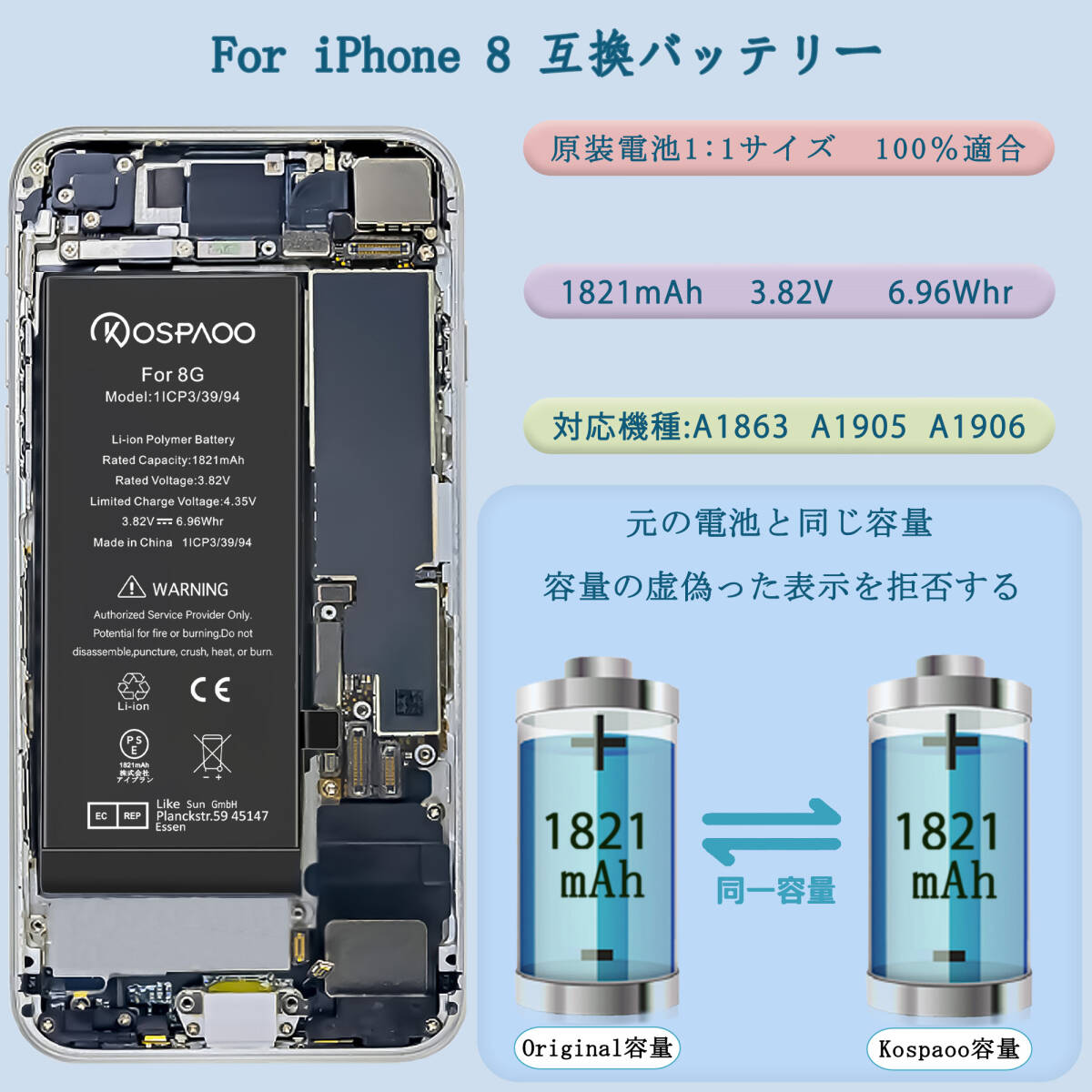 For iPhone8 バッテリー 『工具セット』 標準容量 交換ビデオ 1821mAh PSE準拠 Kospaoo/iPower 互換 Li-ion Battery 交換 修理