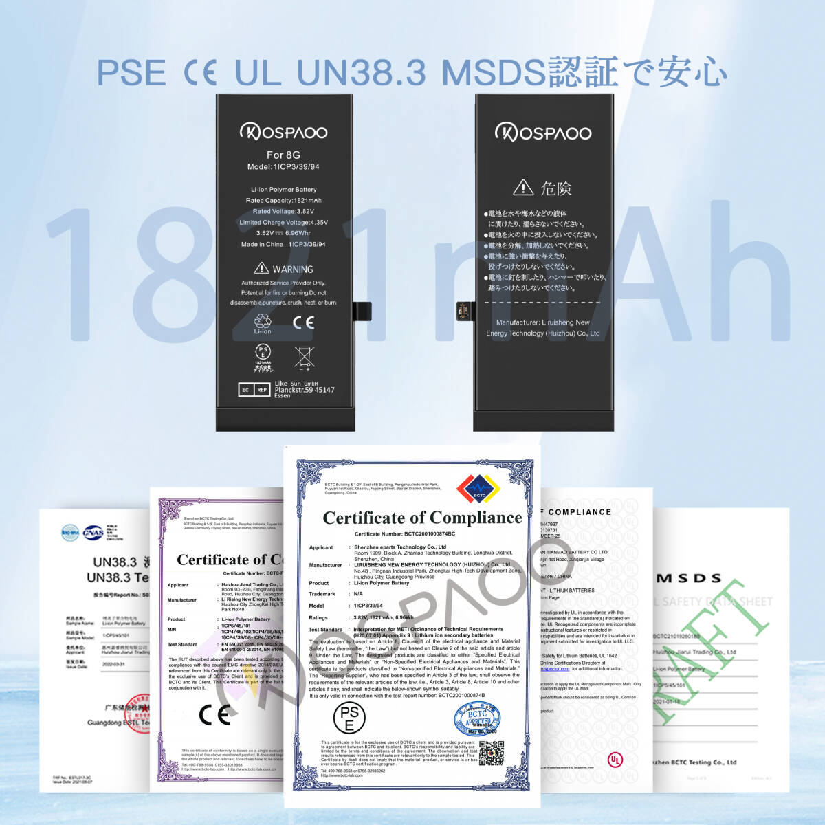 コバルト酸リチウム、グラフェン、有機電解質などの先端材料を使用し、安全性、信頼性、環境性、耐久性、放熱ブロック、極めて膨張しにくいなど、日本や欧州で義務づけられている安全性試験をクリアし、さらに1億円の保険に加入しているので、安心して購入できるバッテリーです。