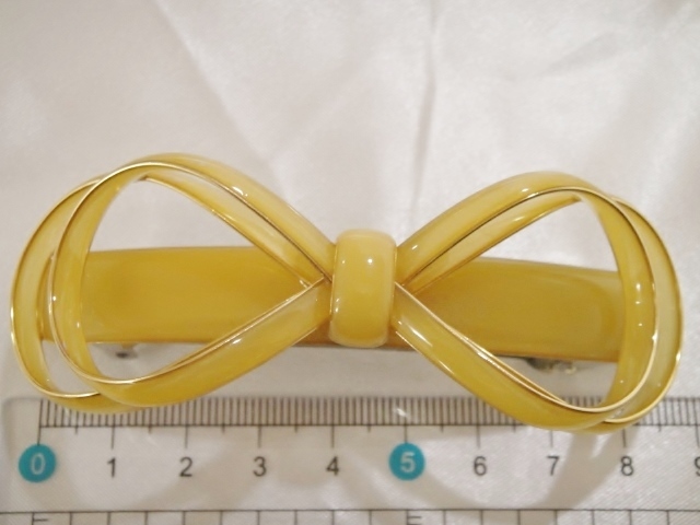♪ 新品 バレッタ 日本製『高品質/ロングサイズ/3Dダブルリボン/グロスエポ/GOLD縁/パール/ベージュ』♪