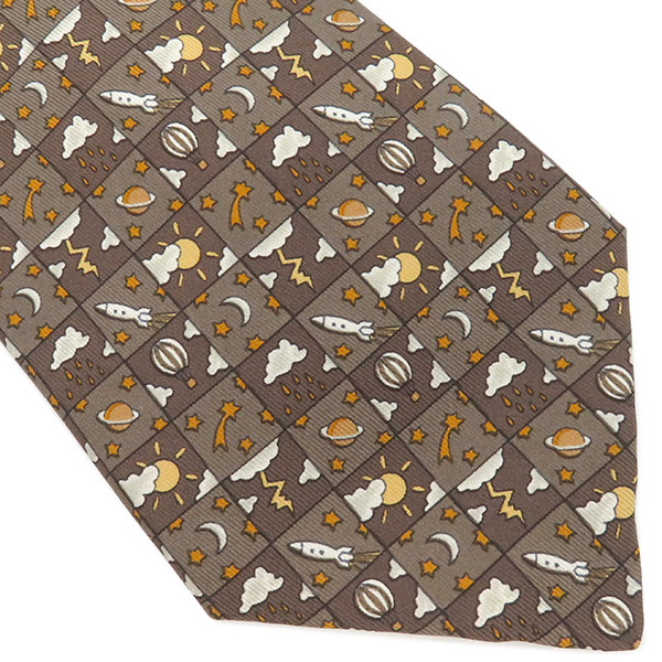 エルメス HERMES ロケットと気球 9cm ネクタイ シルク ブラウン×マルチカラー 茶 天気 晴れ 雷 - メンズ 【箱】定番 人気 美品 | |