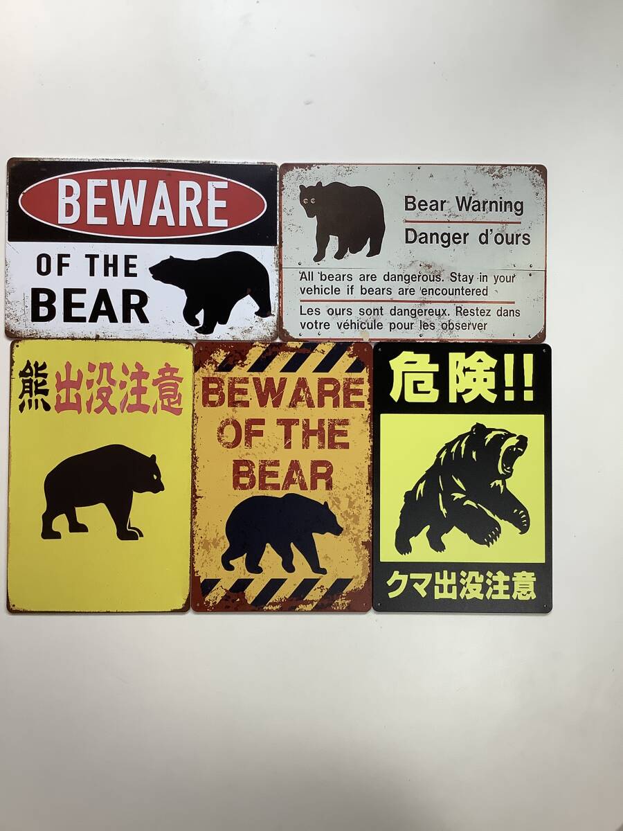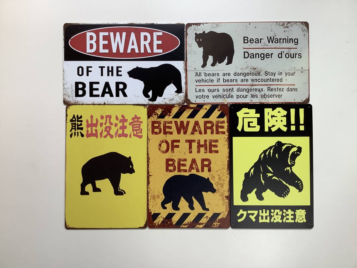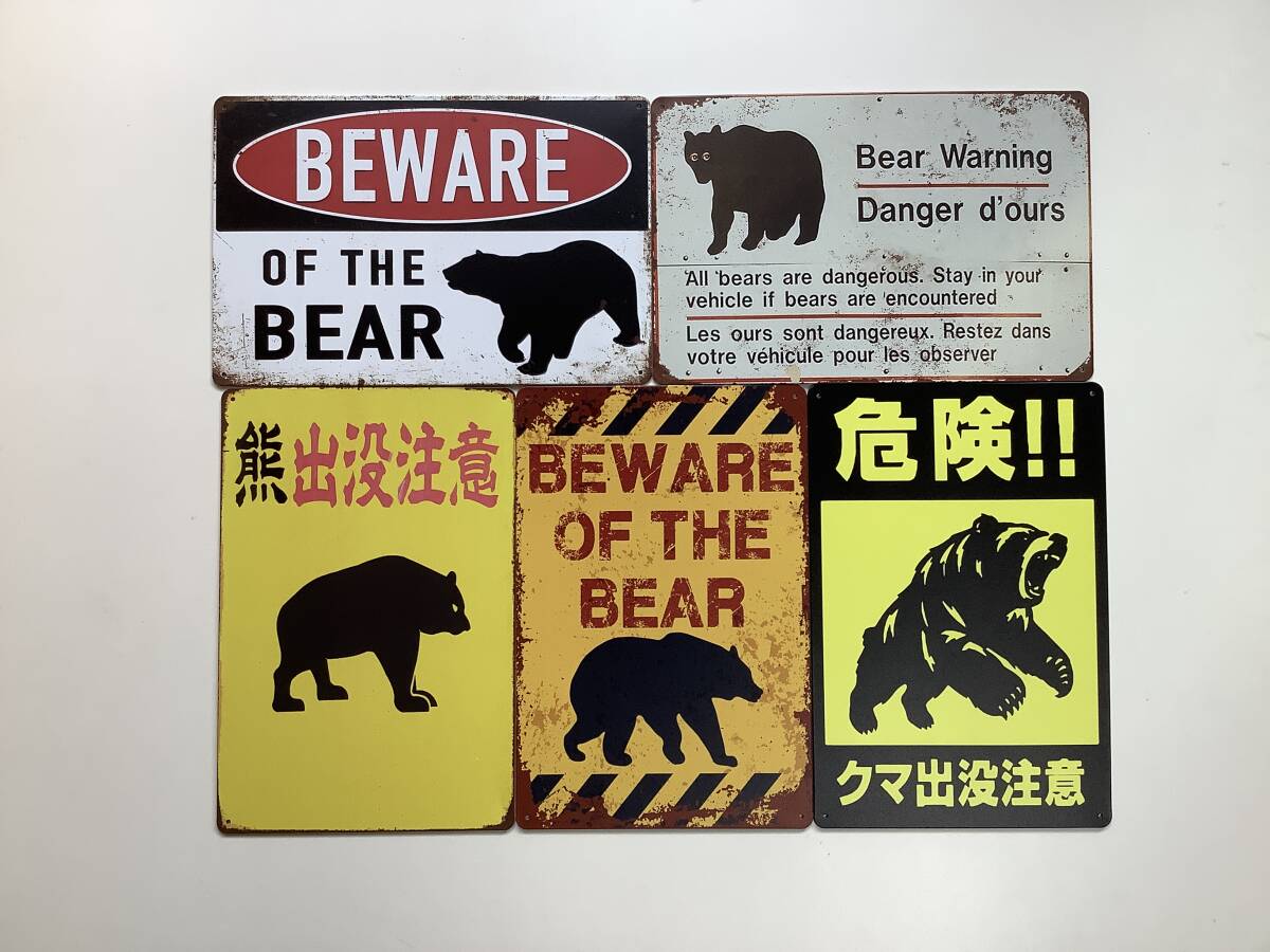 ブリキ看板 20×30㎝ 熊 5枚セット BEWARE OF THE BEAR DANGER 注意 警告 クマ 出没 標識 アメリカンガレージ インテリア 新品 防水 P906