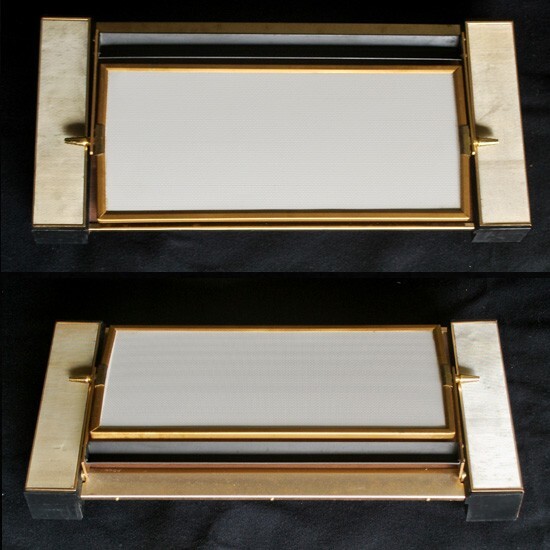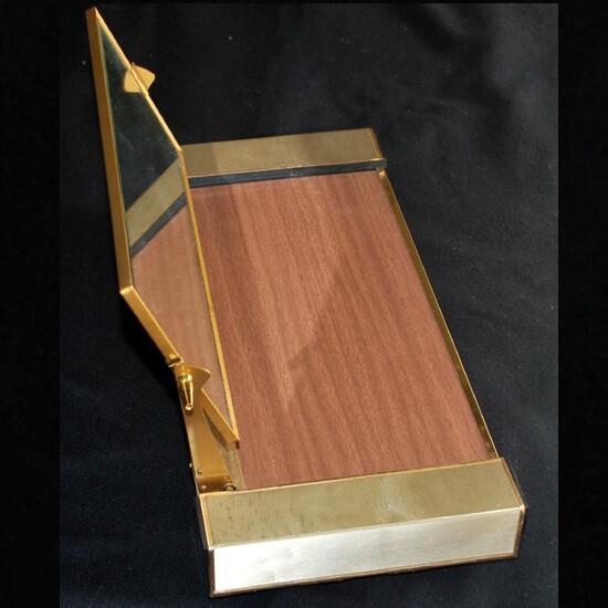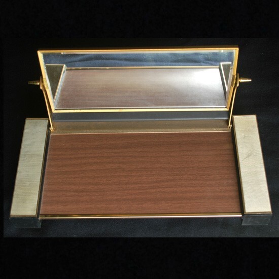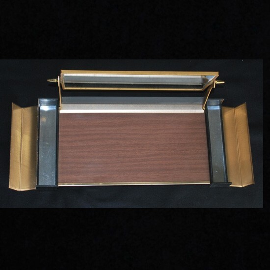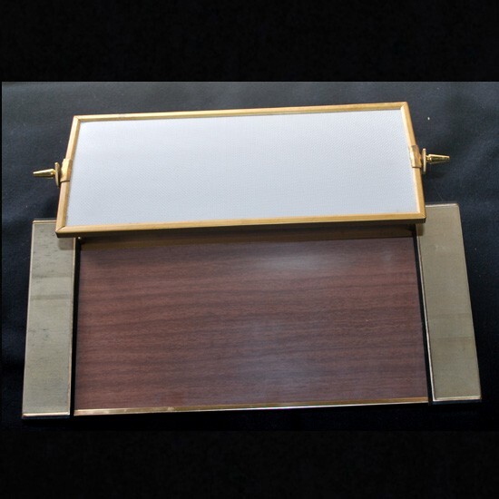 両サイドの収納部分樹脂製、後は合金及びスチール製で、 鏡前の台部分は木目プリント、鏡裏は型押し文様のビニールが貼られています。 しっかりとした素材をお洒落に使い分け、造作されています。 ノベルティ品とはいえ、クオリティの高い逸品! ◆サイズ ◆ ( 収納部分蓋を閉めた最大部分 ) w : 38 . 2 × d : 18 × h : 20 . 2 ( 鏡収納時 7 ) cm 程 ◆ 状態 ◆ 汚れ箇所や小さな傷箇所はあるも、特に酷い傷み箇所は見受けられません。 |