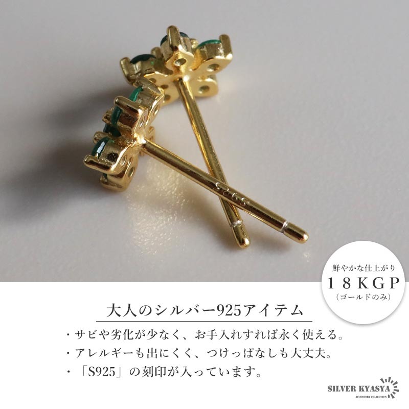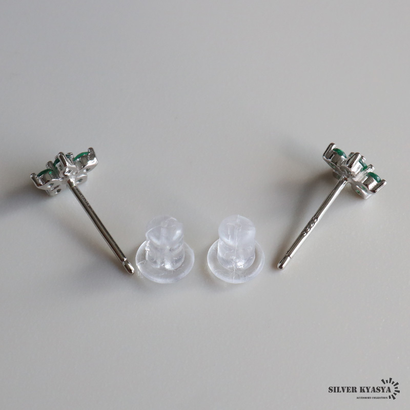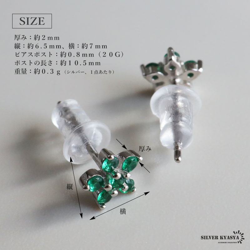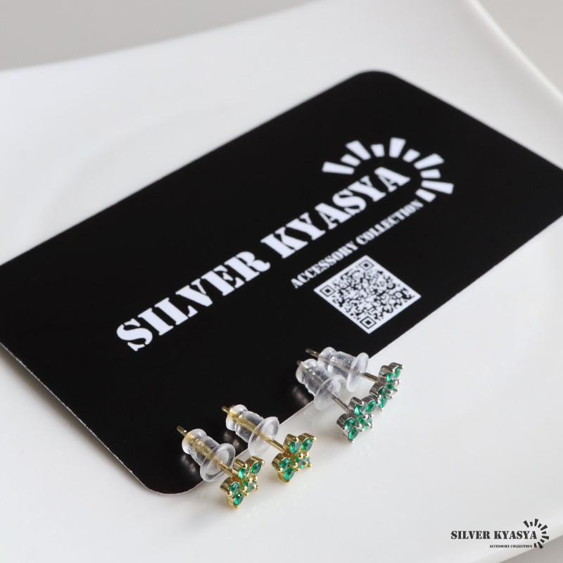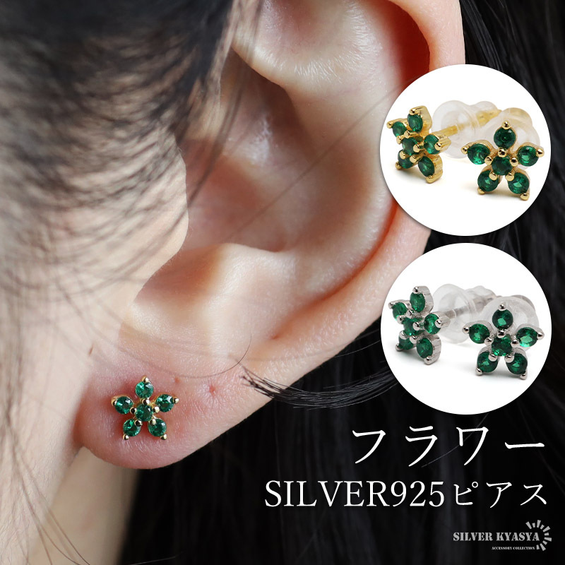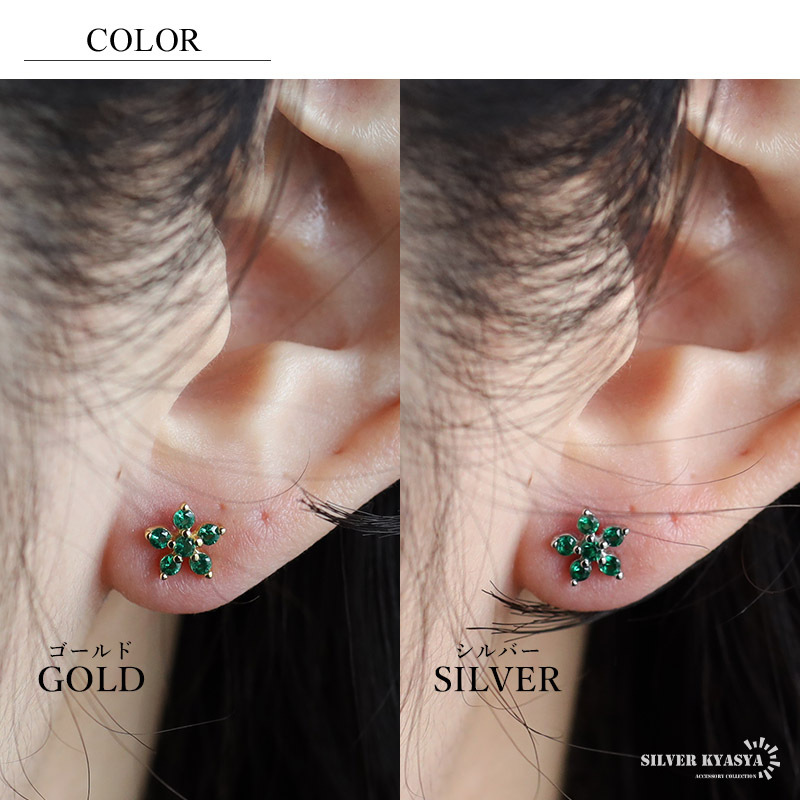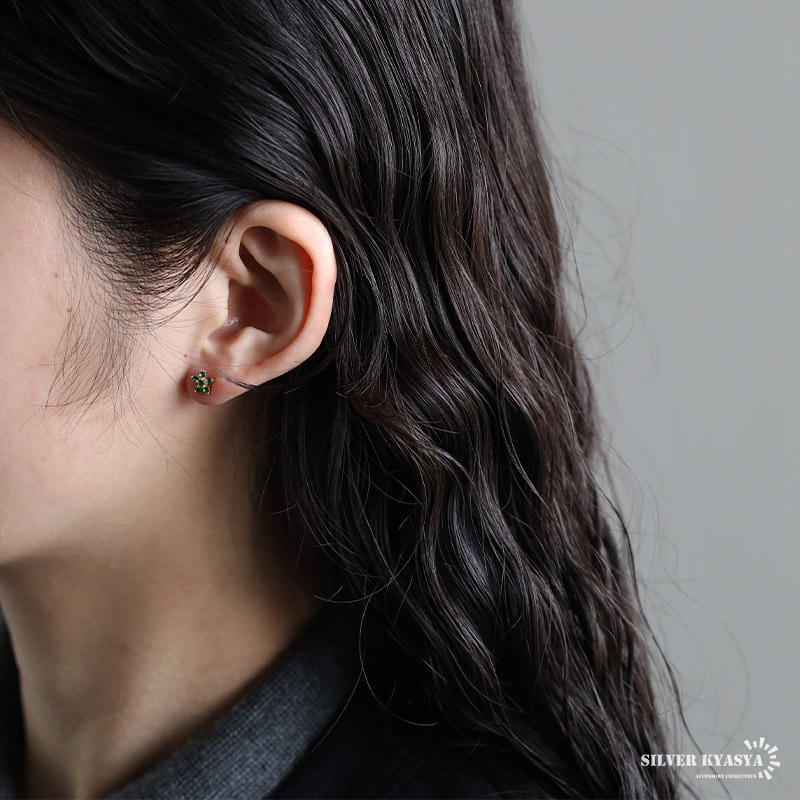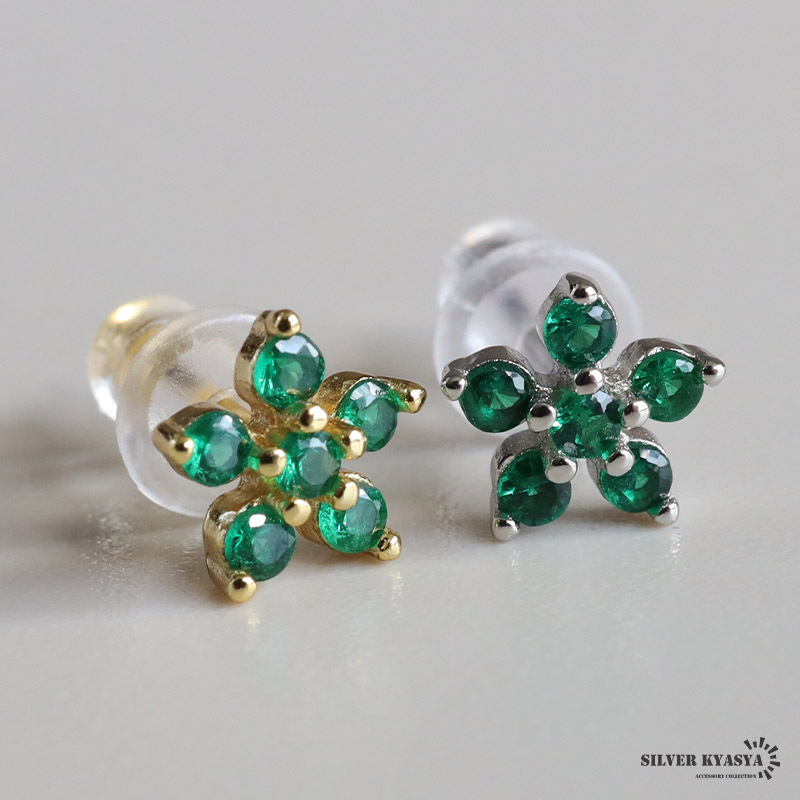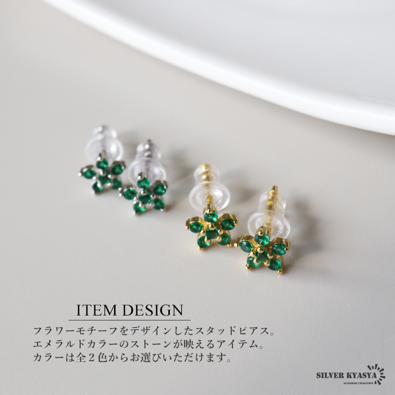 フラワーモチーフをデザインしたスタッドピアス。エメラルドカラーのストーンが映えるアイテム。カラーは全2色からお選びいただけます。