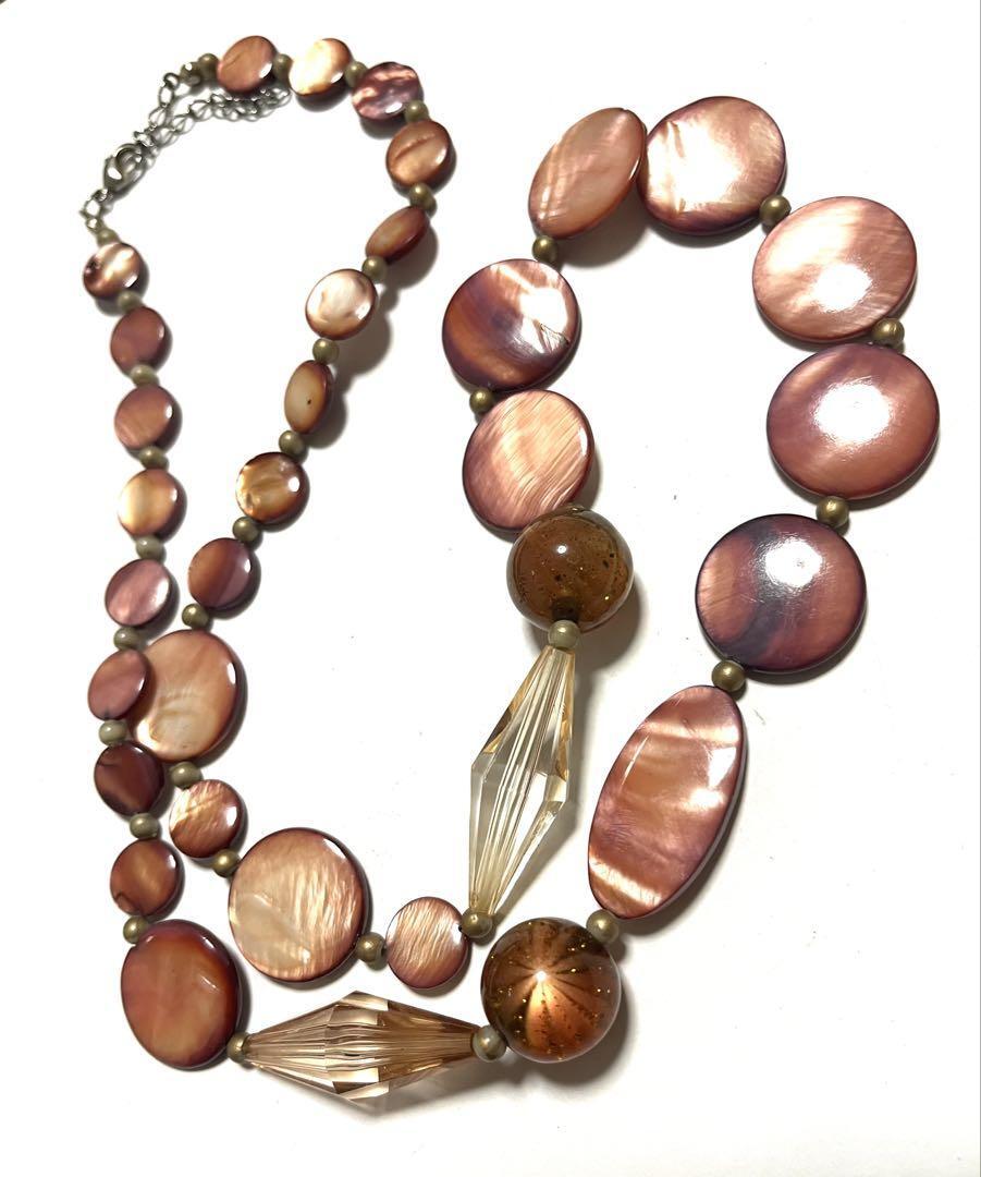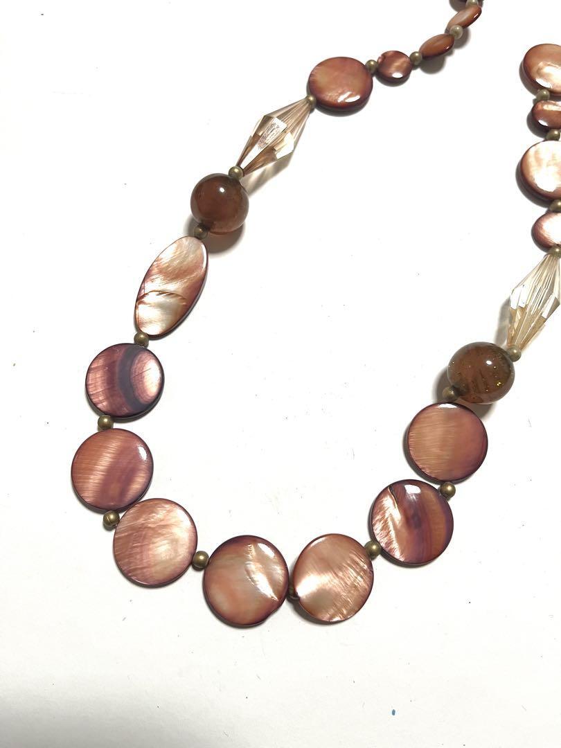 貝殻とクリスタルを使用したピンクとブラウンのビーズネックレス。