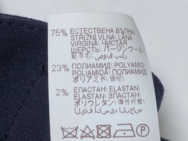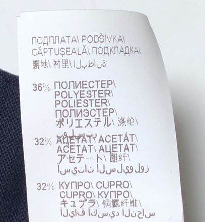 【素 材】    ウール、ポリアミド、ポリウレタン、ポリエステル、アセテート、キュプラ  (タグ写真参照)