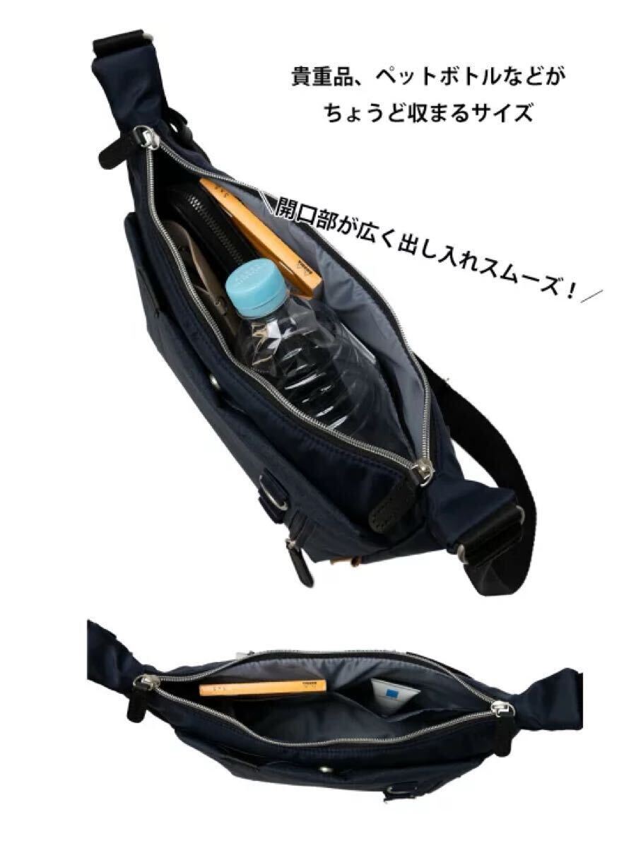 ●ペットボトルや長財布がちょうど入る休日のお出かけにぴったりのショルダーバッグです。人気の杢調ポリを前面ポケット部分に使用しテープをポイントに使ったシンプルでかっこいいデザインになっています。