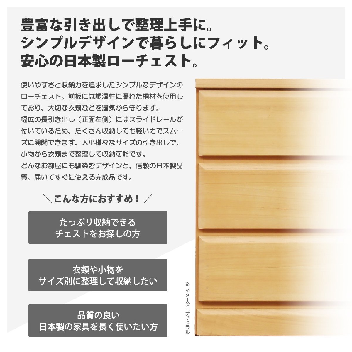 特  徴使いやすさと収納力を追求したシンプルなデザインのローチェスト。