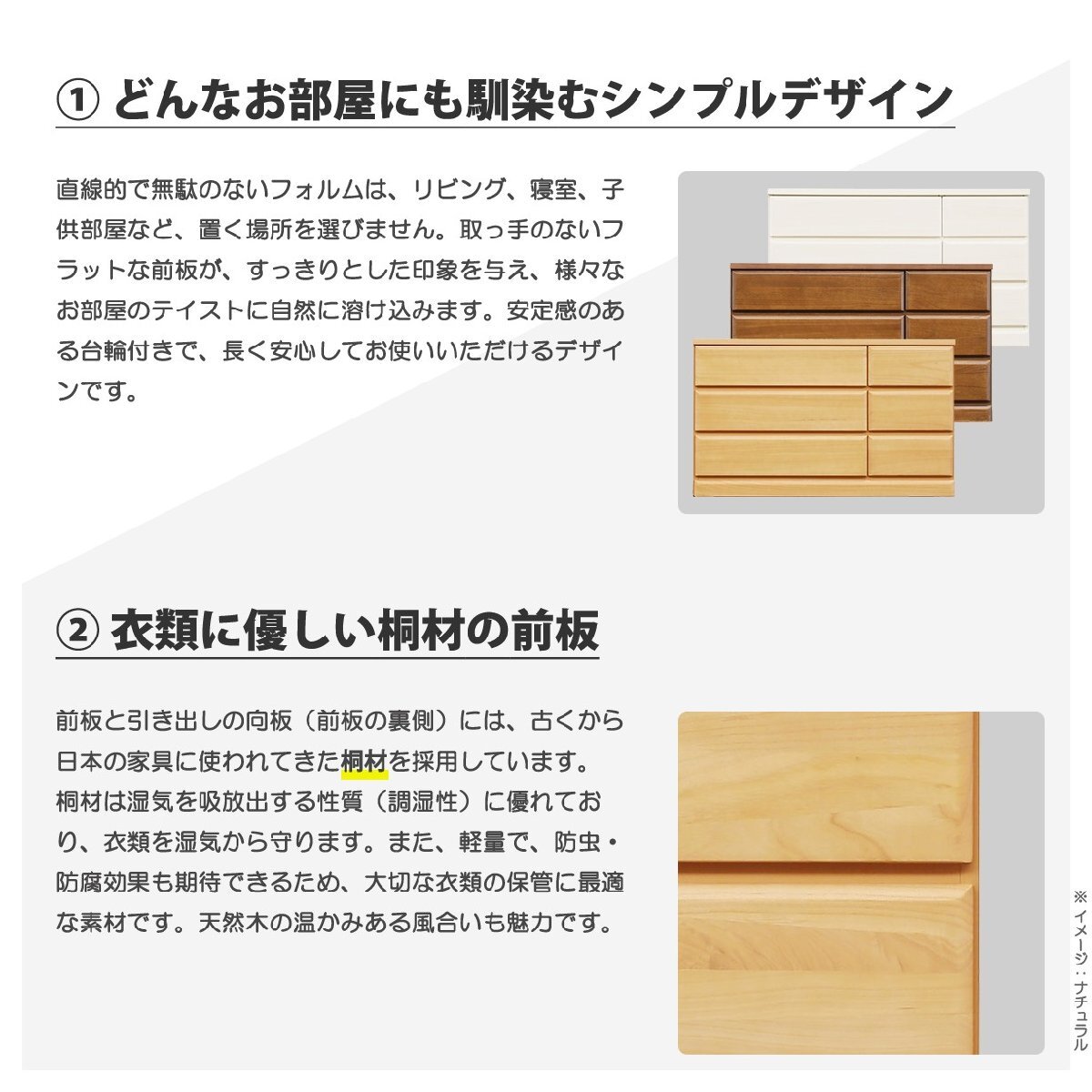前板には調湿性に優れた桐材を使用しており、大切な衣類などを湿気から守ります。