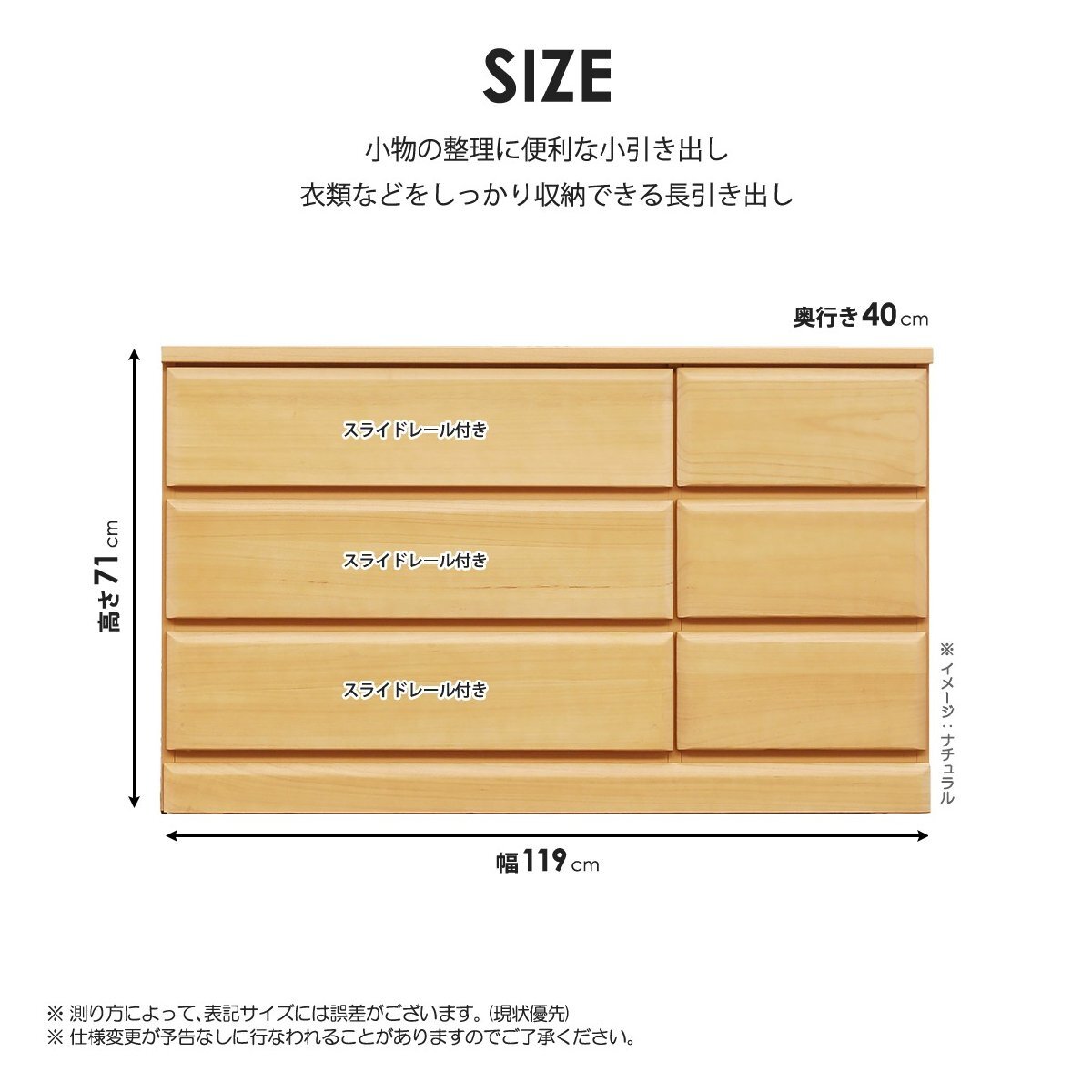 幅広の長引き出し(正面左側)にはスライドレールが付いているため、たくさん収納しても軽い力でスムーズに開閉できます。大小様々なサイズの引き出しで、小物から衣類まで整理して収納可能です。