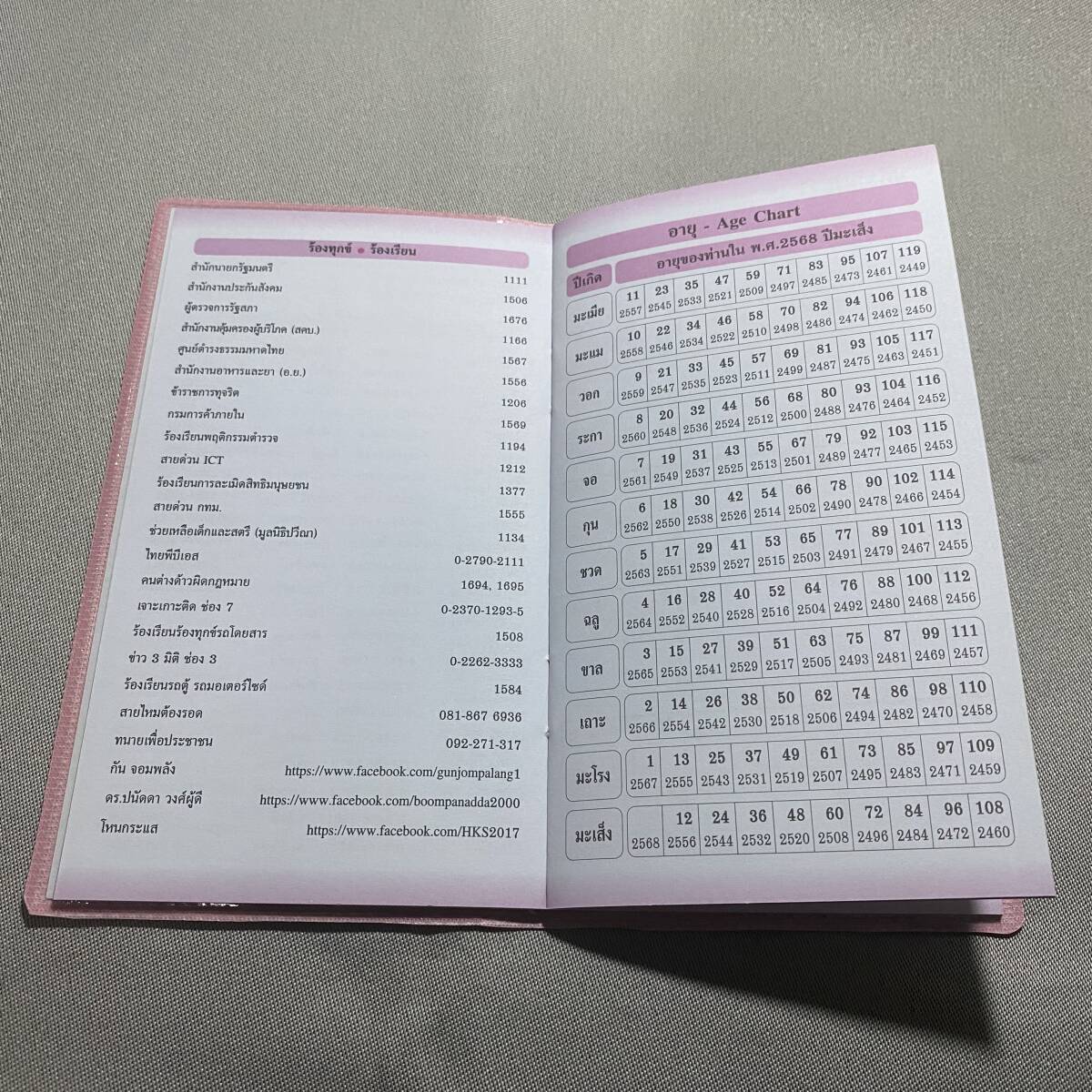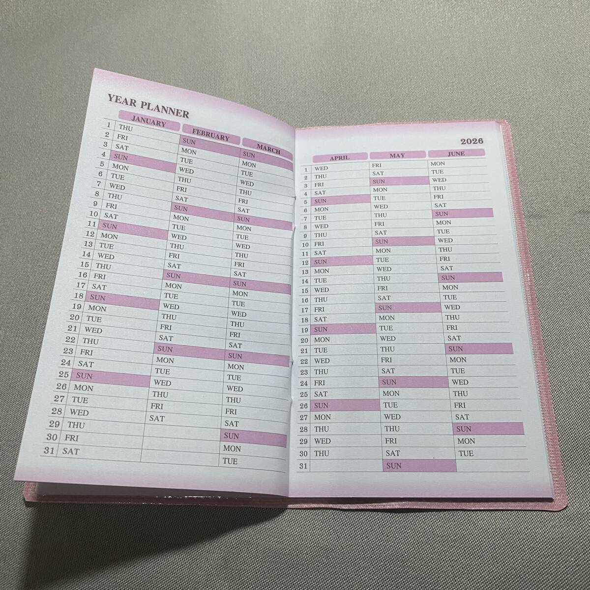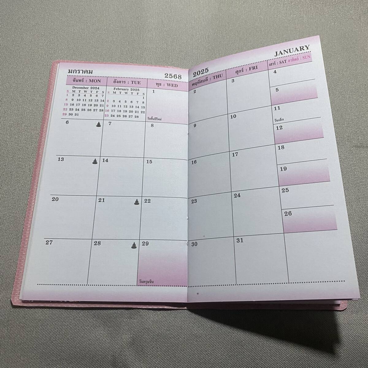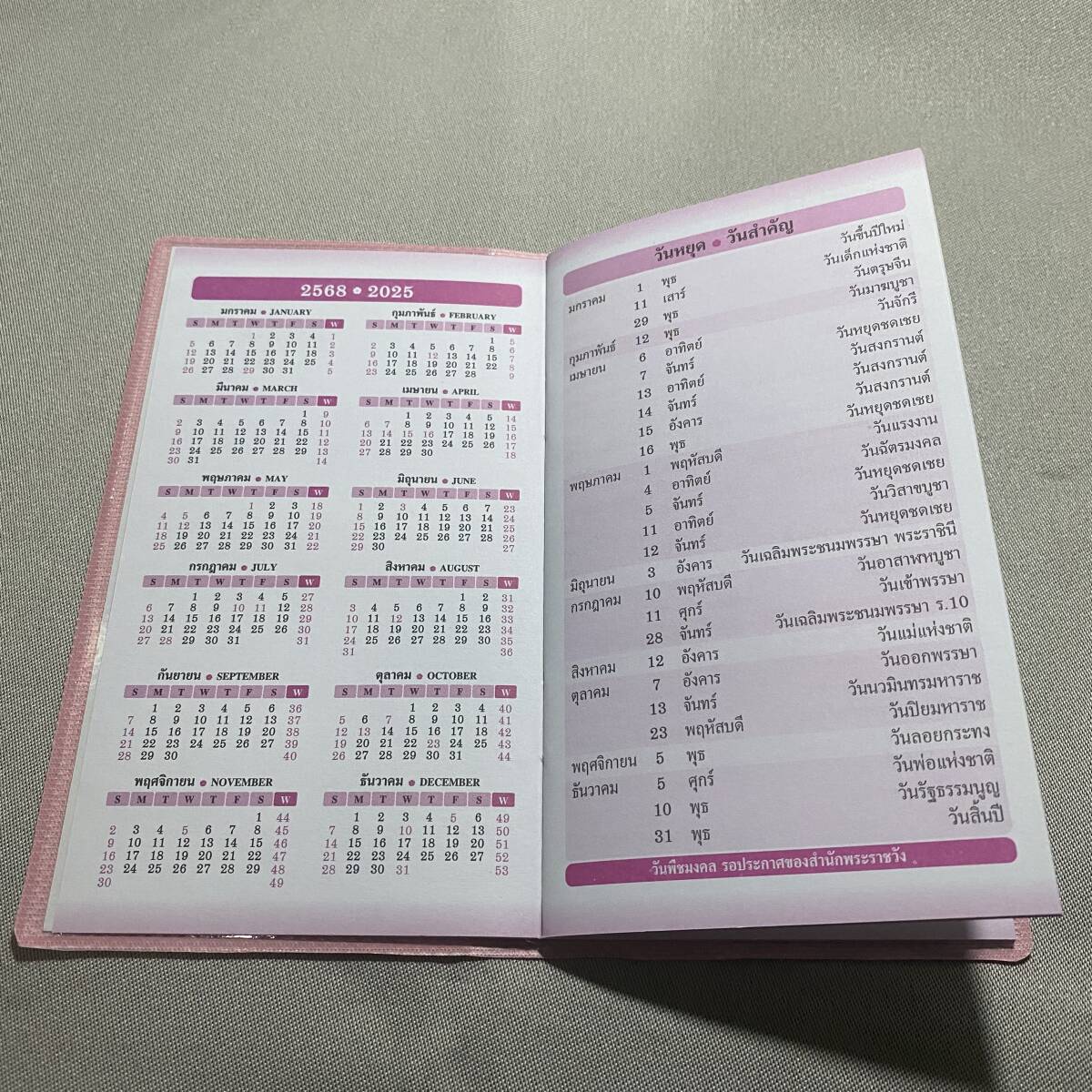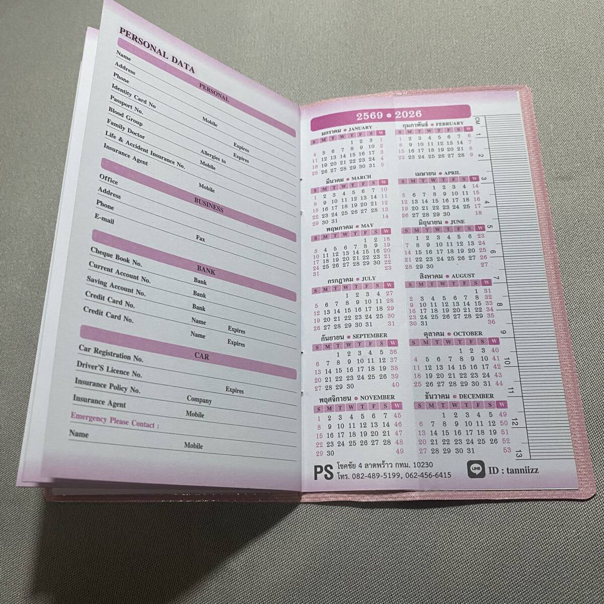 見開きのマンスリー(月曜始まり)をはじめ、各所連絡先、祝日予定、タイ歴と西暦、年齢の早見表、見開きのイヤリープラン(2025年、2026年)、メモ欄等コンパクトで使いやすい一冊です。