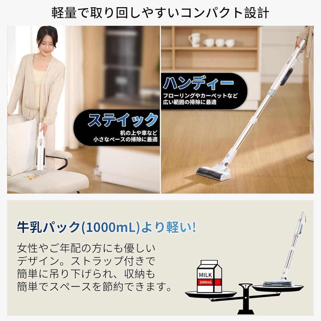 わずか0.73kgの超軽量デザインで、長時間使用しても腕に負担がかかりません。女性やご年配の方も楽にお掃除できます。2WAY仕様のハンディ掃除機およびスティック掃除機として使用でき、①床用ヘッド、②布用ヘッド、③2in1隙間ノズルが付属しています。ハンディ掃除機として車内の清掃にも最適です。