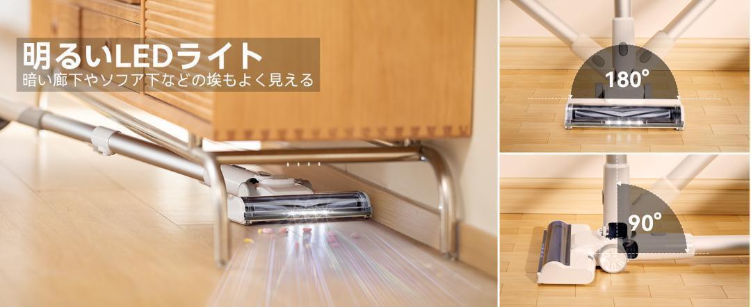 パワーヘッドの先端に明るいLEDライトを4個搭載しています。ソファやベッドの下、家具の裏などの暗い場所でも見やすく掃除ができます。ヘッドが左右180°、上下90°回転し、低い場所や角の掃除も楽に行えます。