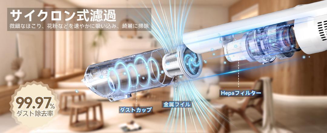 ワンタッチでゴミを捨てることができ、手を汚さずに済みます。ダストカップ全体、金属網やHEPAフィルターはすべて水洗い可能で、再利用できます。サイクロン除塵技術と4層濾過システムにより、小さなほこりの粒子も捕らえ、家に新鮮で清潔な空気を提供します。HEPAフィルターは2つ付属しており、洗って再利用できます。