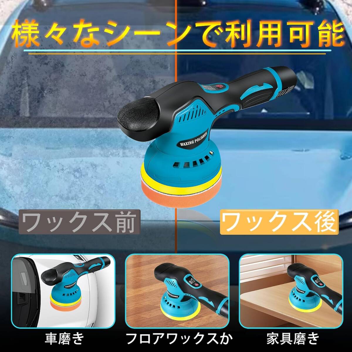 【8段階の変速機能&残電表示】このポリッシャーは高品質の純銅モーターを採用し、強力かつ安定したパワーを提供します。従来品の2段変速ものより多く8段階の変速機能で、研磨シーンに応じて細かく変速できます。2800rpmから5500までワンボタンで1~8段階の速度を設定することができます。 車磨き、ワックスがけ、木工、金属磨き、塗装剥がし、金属製品のサビ取りなど様々なシーンでご使用いただけます。また、ポリッシャーに備えられたバッテリー表示画面により、いつでも電力消費状況を把握でき、バッテリー残量が一目で分かります。当ポリッシャー 充電式は移動便利さと性能を兼ね備えて初心者でも簡単に使えます。
