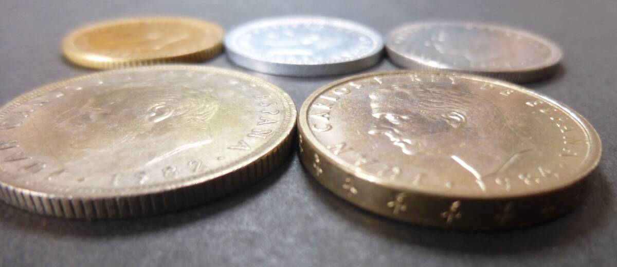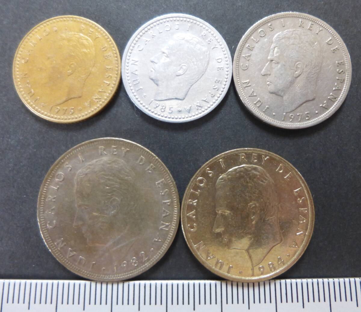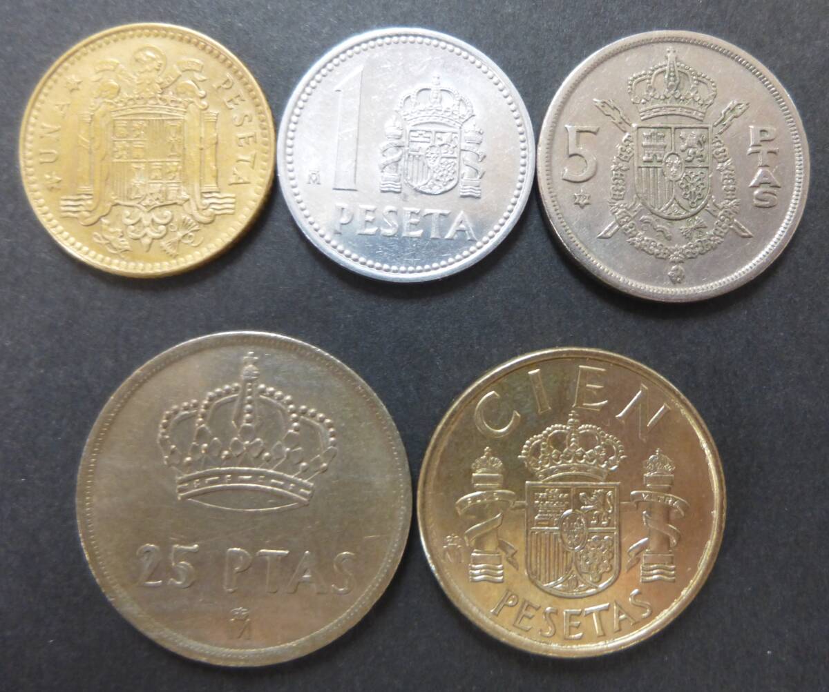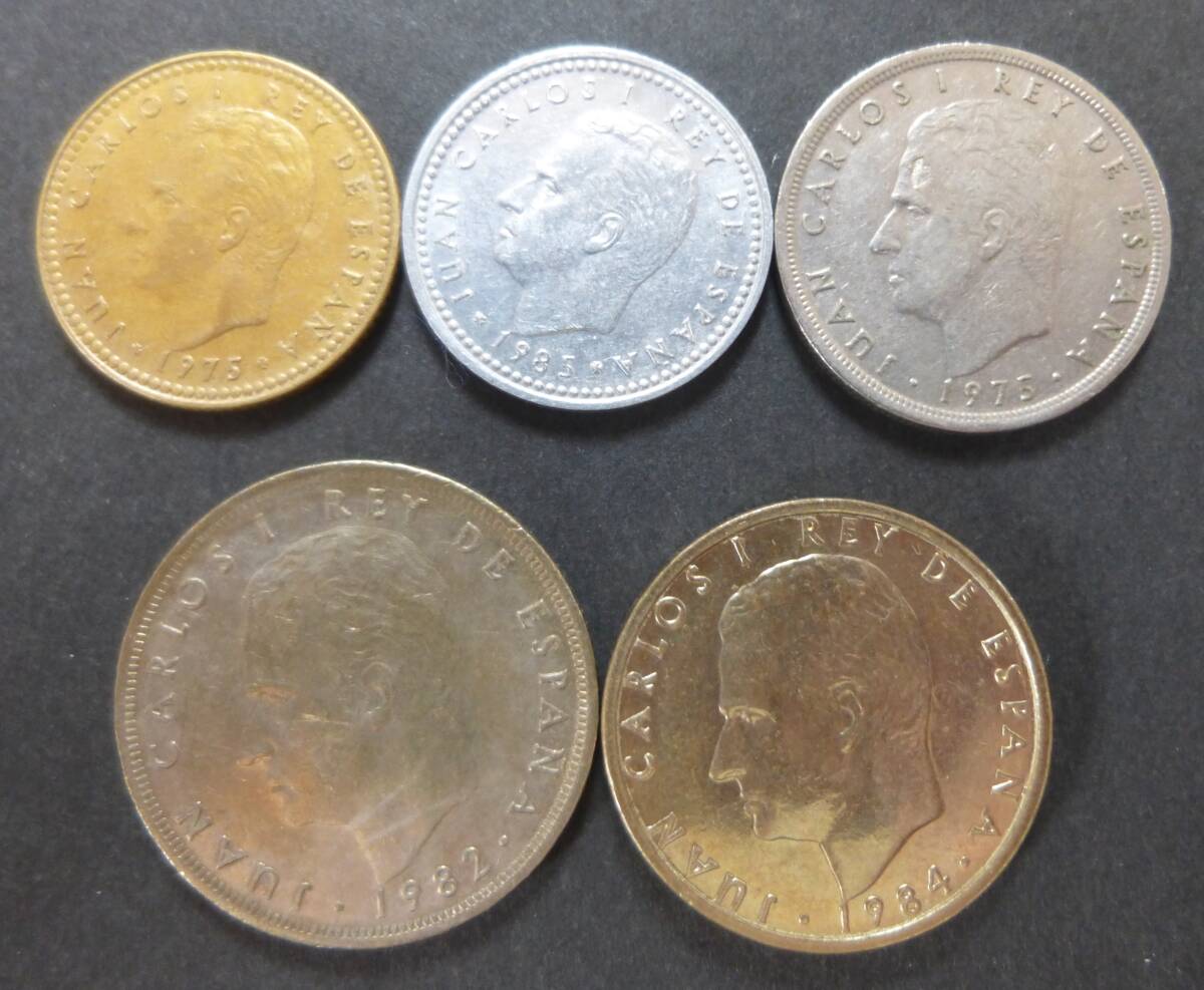 スペインで、 1975年~1985年の間に発行された、 カルロス国王肖像 硬貨 5種・5枚です。
