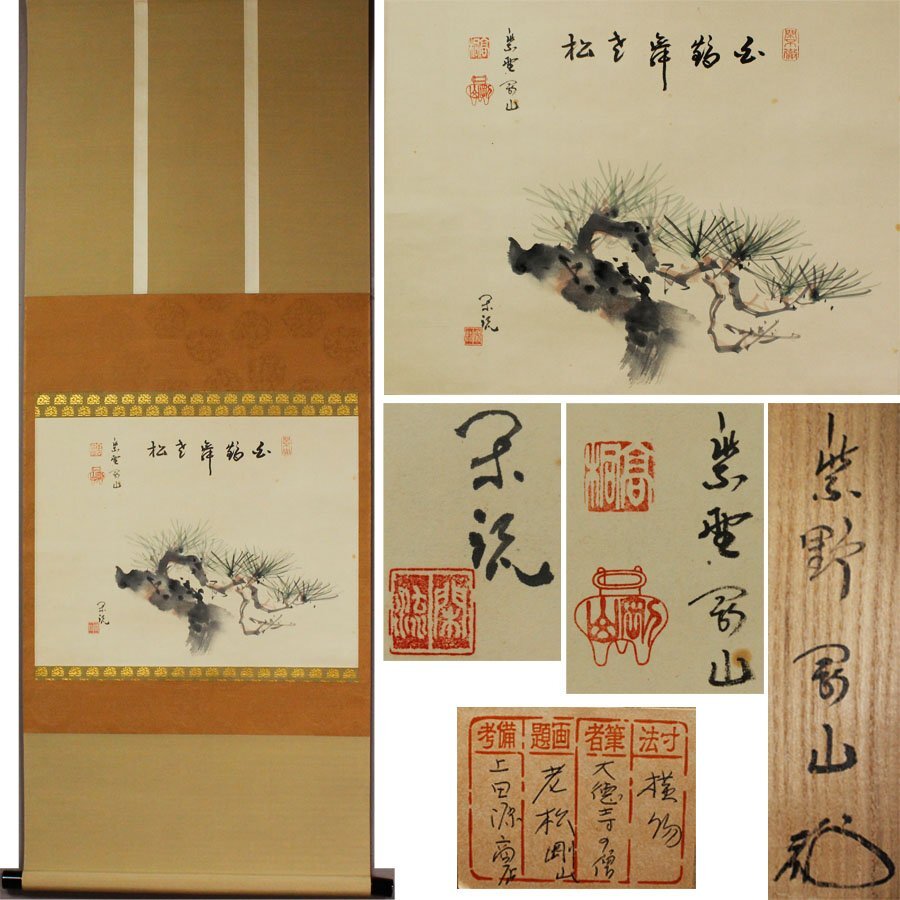 ■商品説明 下記、松永剛山の手により、 独特の筆使いにて、「白鶴舞老松(はっかくろうしょうにまう)」の禅語が書かれ、 木村閑流の手により、 丁寧に松図が描かれた作品です。 (松永剛山による共箱に納まっております。) 《 松永剛山 》 大徳寺 高桐院住職。 昭和18年 大阪府能勢町生まれ。 昭和25年 大阪府長杉寺・松長元祥に就いて得度。 後、京都建仁寺僧堂で、竹田益州に参禅。 昭和46年 大徳寺塔頭高桐院住職。 三重県上野市龍王寺住職を兼務。 大徳寺禅語録集成編纂委員。 久田流有栖川系茶道13代家元・細川三斉流茶道顧問。 《 木村閑流 》 南画・水墨画家・無所属 昭和12年生 新潟県出身。 東京理科大学卒。 高校教諭のかたわら渡瀬凌雲に南画を習う。 昭和54年 京都で作家活動に専念。 昭和63年 大丸京都店にて個展。 以後 各地百貨店にて個展 三人展等、展示会等多数。 ■紙本・肉筆 ■状 態 シミ等少しあり。 ■寸 法 軸寸法/約119.0cm×約45.5cm。 本紙寸法/約 33.0cm×約42.5cm。 ■落 款 御覧の様な銘・落款等あり。 ■箱 松永剛山による共箱。 【即決・送料無料】の表示商品に限り、 一部地域(北海道・沖縄)を除き、送料無料キャンペーンを実施しております。 ご希望の方は、お早めに入札して頂けます様、宜しくお願い致します。 【※※なお、作品に対して疑問や質問がある場合には、※※】 質問欄もしくは、ストア情報に当方の情報が記載されておりますので、こちらをクリックしてお問い合わせ下さい。 宜しくお願い致します。 |